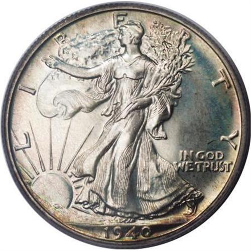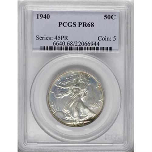 <B>1940 50C PR68 PCGS. CAC.</B></I> Pastel lemon-gold, cherry-red, and lime-green graces the peripheries of this intricately struck Superb Gem. The satiny fields are gloriously pristine, and the eye appeal is outstanding. A finer proof Walking Liberty half can hardly be imagined. Population: 31 in 68, 0 finer (11/07).<BR><I>From The Kallenberg #1 PCGS Registry Set Of Proof Half Dollars.</B></I><BR><BR><B>Coin Engraver:</B> Adolph A. Weinman<BR><BR><b>Shipping:</b> Coins & Currency (<a target="_blank" href="http://www.heritageauctions.com/common/shipping.php">view shipping information</a>)