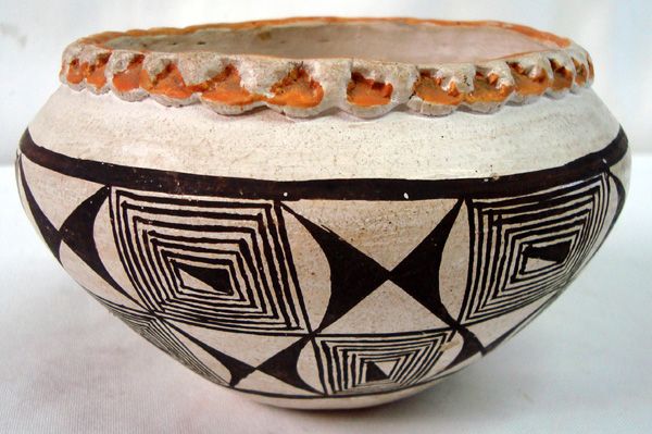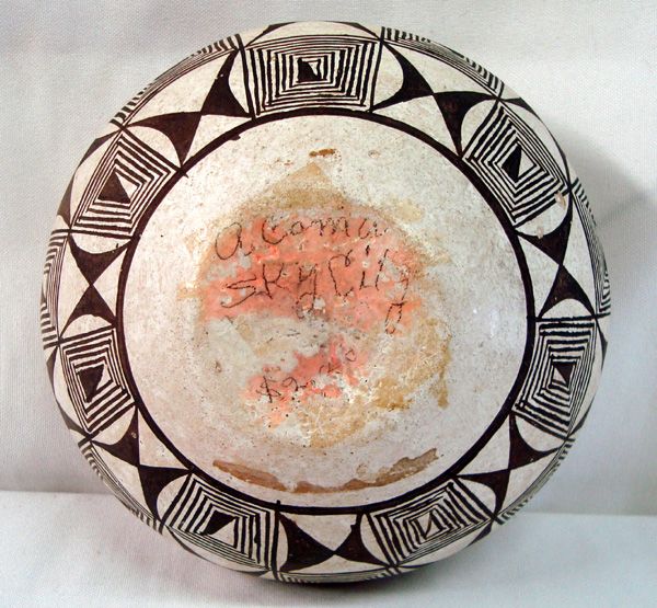 1940-50s Native American Acoma Polychrome Bowl. Geometric Mimbres-style designs on outside. 3.75''H x 5.5''diameter. Rough bottom with writing Acoma Sky City. Line of scraped paint on bottom edge. Nice piece for the collector.