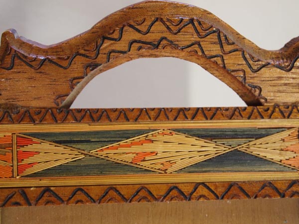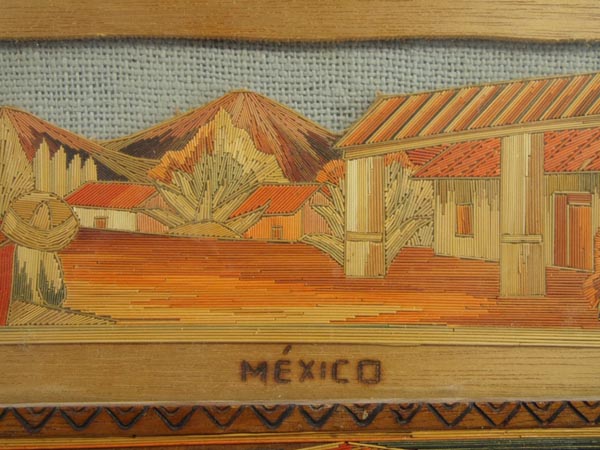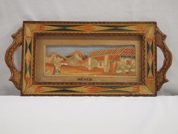 1940-50s Mexican Popote (Straw) Mosaic Tray. Very fine straw mosaic scene on bottom of tray, under glass. Also straw mosaic design around perimeter of tray. Carved design in wood. Has hooks on back for hanging also. Measures 16''Lx7.25''W. Buyers pay actual shipping and handling charges (see terms and conditions for more information).