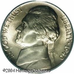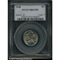 1940 5C MS67 Full Steps PCGS. Light apricot-golden <B>1940 5C MS67 Full Steps PCGS.</B></I> Light apricot-golden patina equally blankets each side. Well defined throughout, only a couple of tiny abrasions are seen on the reverse. Population: 11 in 67 FS, 0 finer (10/04). <BR><BR><B>Important notice:</B> Heritage usually auctions material at the rate of 200-250 lots per hour. On some occasions eBay Live bid software or the Internet may not be able to keep up with the pace of the auction. We recommend placing a realistic absentee bid now as insurance to avoid disappointment. Occasionally the auctioneer may eliminate or reject an eBay Live bid, and the auctioneer may also reopen a lot after the close of the eBay live bidding (usually because we missed an audience bid), and may reject your bid even if it shows you as the winning bidder. By bidding via eBay Live, you agree that Heritage may award the lot to another bidder at its sole discretion under the circumstances described above or any other reasonable circumstances. Since eBay bids are not shown to us until we open the lot on the floor, we treat those bids just like floor bids. In most cases the floor responds before the eBay bid is presented to us, due to Internet lag time, so for consistency we have made it a policy that floor bids are always considered first over tie eBay live bids. Also please note that all Heritage lots purchased through eBay Live carry a 20% Buyer's Premium. Please make sure you read the Terms and Conditions before you bid. This lot is being auctioned in conjunction with a live floor auction by Heritage Galleries & Auctioneers. All final auction and invoice information will be supplied by Heritage Galleries & Auctioneers, and all other information should be considered preliminary. Lot:5631