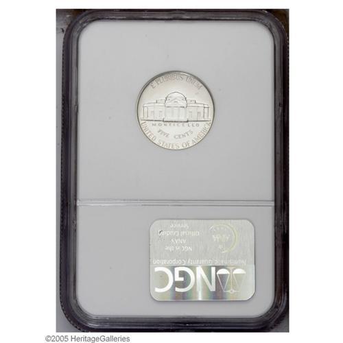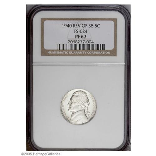 <B>1940<5C> Reverse of 1938 PR67 NGC.</B></I> FS-024. Brilliant white and well struck with a superb overall appearance. According to Ron Guth and Bill Gale in their 2002 edition of <I>United States Proof Sets and Mint Sets,</B></I> the Reverse of 1938 (with wavy steps on Monticello) is currently "approximately fifty times rarer" than the Reverse of 1940 variety. Population: 7 in 67, 1 finer (9/05).<BR><I>From The Sounder Collection.</B></I>