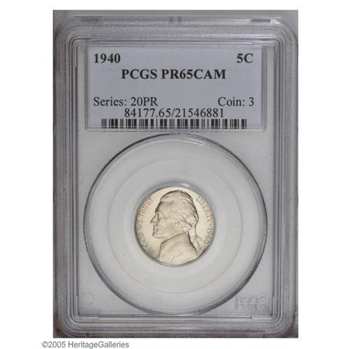 <B>1940<5C> Reverse of 1940 PR65 Cameo PCGS.</B></I> A well struck Gem with a fully brilliant, untoned appearance overall. Each side portrays a pronounced cameo effect due to light frosting on the devices. The so-called "reverse of 1940" is considered much more available than the earlier "reverse of 1938" variety. Population: 3 in PR65 Cameo, 0 finer (9/05).<BR><I>From The Sounder Collection.</B></I>
