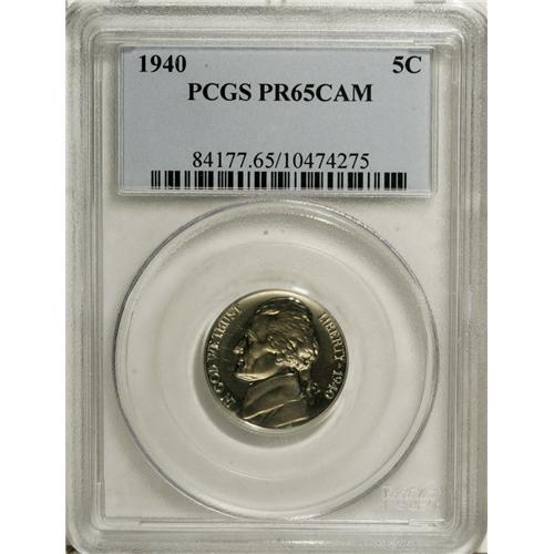 <B>1940 5C Reverse of 1940 PR65 Cameo PCGS.</B></I> The top step is heavy on the 1940 Reverse variety. A lovely impeccably struck cameo that displays just the slight hint of incipient toning on Jefferson's portrait. Tantalizingly close to the next highest grade level. Population: 4 in 65 Cameo, 0 finer (10/06).<BR><BR><b>Shipping:</b> Coin/Currency (<a target="_blank" href="http://www.heritageauctions.com/common/shipping.php">view shipping information</a>)