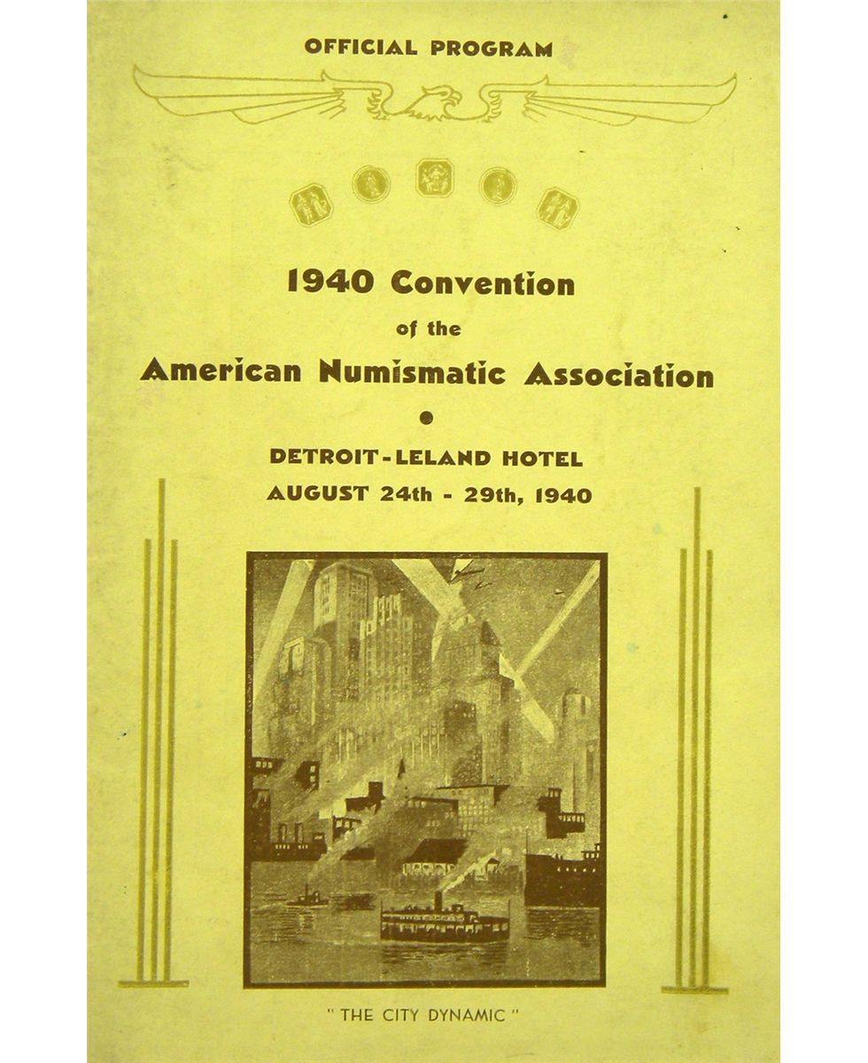 American Numismatic Association. OFFICIAL PROGRAM. 1940 CONVENTION OF THE AMERICAN NUMISMATIC ASSOCIATION. Detroit, Aug. 24–29, 1940. 8vo, original printed card covers. (20) pages; illustrated. Very good or better. [with] Detroit Coin Club. THE DETROIT KORN CLUB SNOOZE. “First & Last Issue,” Aug. 28, 1940, “Price 1 Saw Buck.” Single sheet, 28 by 16.5 cm, printed on one side. Folded. Fine. [with] Detroit Coin Club and American Numismatic Association. ANNUAL BANQUET. MENU AND PROGRAM. Detroit, Aug. 28, 1940. 20 by 12.5 cm. Card stock, folded to make four pages. Fine. The relatively common Official Program for the 1940 ANA Convention, with two rare inserts. The Detroit Korn Club Snooze is a humorous flyer presenting “the eighty-seven regular committees who have toiled day and night for this convention,” all of which were made up of General Chairman George W. Needels, and managing to print a rather condensed three-act play, From Rags to Riches, by “Horatio Mehl,” involving a poor family finding a 1913 Liberty Nickel and selling it to the other Mehl.