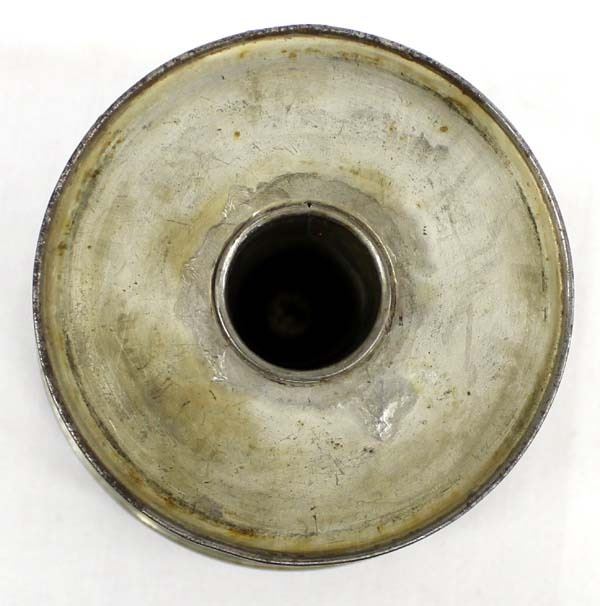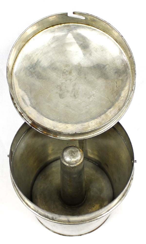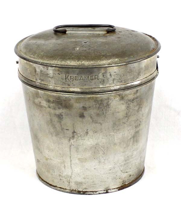 1940's Kreamer tin with a locking lid. Steamed pudding mold, inside has a spindle. The lid has a handle on the top and a slot/pin locking feature.The tin is stamped ''Kreamer'' on the lid. It measures approximately 5 3/4 inches high (including lid). The top diameter is about 5 inches, and the bottom diameter is about 4 inches.