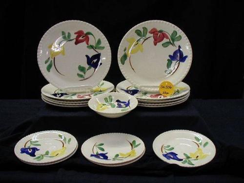 1940 BLUE RIDGE BY SOUTHERN POTTERIES inCARNIVALin CANDLEWICK HND. PTD. INCLUDES (10) 9 3/8in PLATES EXCELLENT (6 W/RIM FLAKES), (2) SAUCERS EXCELLENT (3 W/RIM FLAKES), (1) 5 3/8in BOWL W/RIM FLAKE, 22 PC