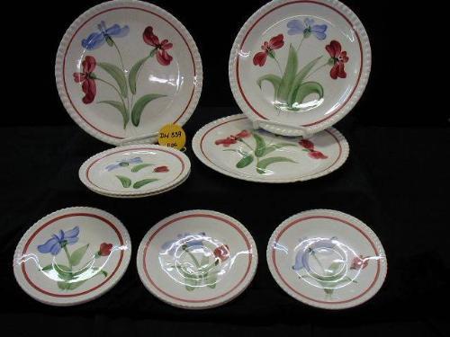 1940 BLUE RIDGE BY SOUTHERN POTTERIES inDUTCHin CANDLEWICK HND. PTD. INCLUDES (3) 9 3/8in PLATES (ALL W/RIM FLAKES), (4) IRIS SAUCERS, (2) SAUCERS (W/RIM CHIPS), (2) BREAD PLATES (1 W/EDGE CHIP), 11 PC