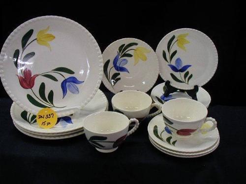 1940 BLUE RIDGE BY SOUTHERN POTTERIES inPRIM?in CANDLEWICK HND PTD INCLUDES (4) 9 1/4in PLATES, (4) 6 1/8in BREAD PLATE, (4) SAUCERS, (3) CUPS (1 W/RIM CHIPS), 15 PC