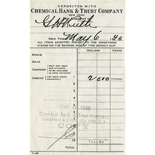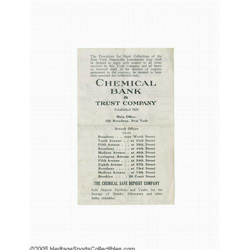 <B>1940 Babe Ruth Signed Bank Deposit Slip.</B></I> Attention Ruth collectors! As the value of the Babe's personal checks continues to climb as high as a Bambino blast, we offer a companion piece never before seen on the collecting landscape. Direct from Ruth's favored "Chemical Bank Trust Company" comes this 3.5x5.5" deposit slip, placing $2000 in the definitive slugger's account on May 6, 1940. All black fountain pen ink, including the Babe's preferred "G.H. Ruth" banking autograph, is an undeniable 10/10 in quality. The slip was once folded into quarters, but the resulting fold lines offer no distraction and do not affect the tremendous quality of the Babe's writing in the slightest. Given the upward trend in the Ruth autograph market, it's clear that the collector who deposits this piece in his collection will soon be laughing all the way to the bank. <I>LOA from PSA/DNA.</B></I> <BR><BR><B>Important notice:</B> Heritage usually auctions material at the rate of 200-250 lots per hour. On some occasions eBay Live bid software or the Internet may not be able to keep up with the pace of the auction. We recommend placing a realistic absentee bid now as insurance to avoid disappointment. Occasionally the auctioneer may eliminate or reject an eBay Live bid, and the auctioneer may also reopen a lot after the close of the eBay live bidding (usually because we missed an audience bid), and may reject your bid even if it shows you as the winning bidder. By bidding via eBay Live, you agree that Heritage may award the lot to another bidder at its sole discretion under the circumstances described above or any other reasonable circumstances. Since eBay bids are not shown to us until we open the lot on the floor, we treat those bids just like floor bids. In most cases the floor responds before the eBay bid is presented to us, due to Internet lag time, so for consistency we have made it a policy that floor bids are always considered first over tie eBay live bids. Also please note that all Heritage lots purchased through eBay Live carry a 22.5% Buyer's Premium. Please make sure you read the Terms and Conditions before you bid. This lot is being auctioned in conjunction with a live floor auction by Heritage Galleries & Auctioneers. All final auction and invoice information will be supplied by Heritage Galleries & Auctioneers, and all other information should be considered preliminary. Lot:19076 <BR><BR><B>Winning Notification and Billing:</B> After the FINAL session in this auction is complete, Heritage will send e-mail and snail mail invoices. This process normally takes several days. All final auction and invoice information will be supplied by Heritage Galleries & Auctioneers, and all other information should be considered preliminary. <BR><BR>This auction will be conducted on a live auction floor and over the Internet through eBay Live. If you choose to place an absentee bid, please take a moment to <font color='#0000ff'><u><a href='http://pages.ebay.com/liveauctions/help/before/laabsentee.html'>learn how eBay Live absentee bidding works</a></u></font><font color='#000000'>
