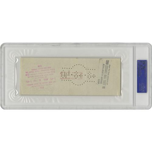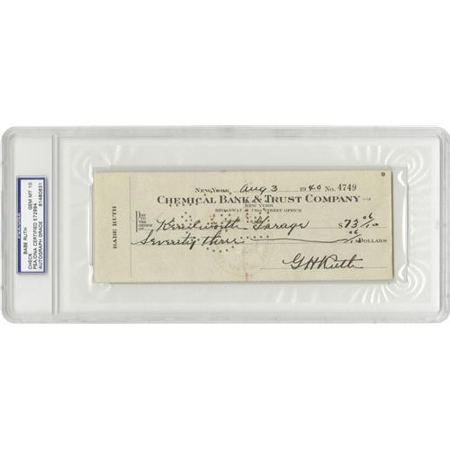<B>1940 Babe Ruth Signed Check, Autograph Grade PSA Gem Mint 10.</B></I> Yes, that's right, a perfect Gem Mint 10 autograph from the banking Babe! And who could question the score? The standard "GH Ruth" signature is rendered in the boldest, blackest ink imaginable, as is the balance of Ruth's handwriting, which pays $76.06 to Kenilworth Garage on August 3, 1940. The check drawn on the Bambino's personal Chemical Bank & Trust Company account has a single vertical center fold, but neither this nor the bank's punch coding dare impede upon the brilliance of his autograph. Search no further, perfection is staring you in the face. Slabbed by PSA/DNA for protection, unquestioned authenticity, and a guarantee of signature supremacy. <BR><BR><B>Important notice:</B> Heritage usually auctions material at the rate of 200-250 lots per hour. On some occasions eBay Live bid software or the Internet may not be able to keep up with the pace of the auction. We recommend placing a realistic absentee bid now as insurance to avoid disappointment. Occasionally the auctioneer may eliminate or reject an eBay Live bid, and the auctioneer may also reopen a lot after the close of the eBay live bidding (usually because we missed an audience bid), and may reject your bid even if it shows you as the winning bidder. By bidding via eBay Live, you agree that Heritage may award the lot to another bidder at its sole discretion under the circumstances described above or any other reasonable circumstances. Since eBay bids are not shown to us until we open the lot on the floor, we treat those bids just like floor bids. In most cases the floor responds before the eBay bid is presented to us, due to Internet lag time, so for consistency we have made it a policy that floor bids are always considered first over tie eBay live bids. Also please note that all Heritage lots purchased through eBay Live carry a 22.5% Buyer's Premium. Please make sure you read the Terms and Conditions before you bid. This lot is being auctioned in conjunction with a live floor auction by Heritage Galleries & Auctioneers. All final auction and invoice information will be supplied by Heritage Galleries & Auctioneers, and all other information should be considered preliminary. Lot:19075 <BR><BR><B>Winning Notification and Billing:</B> After the FINAL session in this auction is complete, Heritage will send e-mail and snail mail invoices. This process normally takes several days. All final auction and invoice information will be supplied by Heritage Galleries & Auctioneers, and all other information should be considered preliminary. <BR><BR>This auction will be conducted on a live auction floor and over the Internet through eBay Live. If you choose to place an absentee bid, please take a moment to <font color='#0000ff'><u><a href='http://pages.ebay.com/liveauctions/help/before/laabsentee.html'>learn how eBay Live absentee bidding works</a></u></font><font color='#000000'>