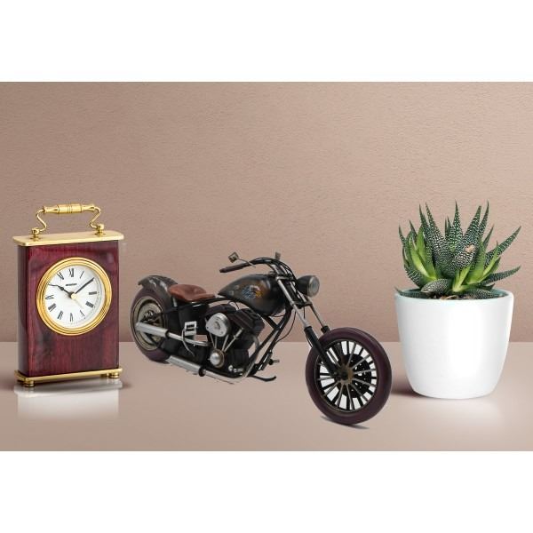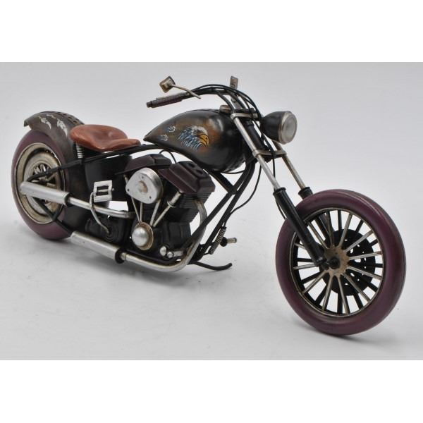 Decorate for any table, desk, or shelf in sporty fashion with Rustic Iron 1940S Harley Davidson Chopper Metal Motorcycle Sculpture. Featuring a rustic iron frame, this charming vintage Motorcycle includes detailed craftsmanship. The Brown metal seat and handlebars are finished in natural colors. Dimensions: approx (H X W): 7X14 Inches.