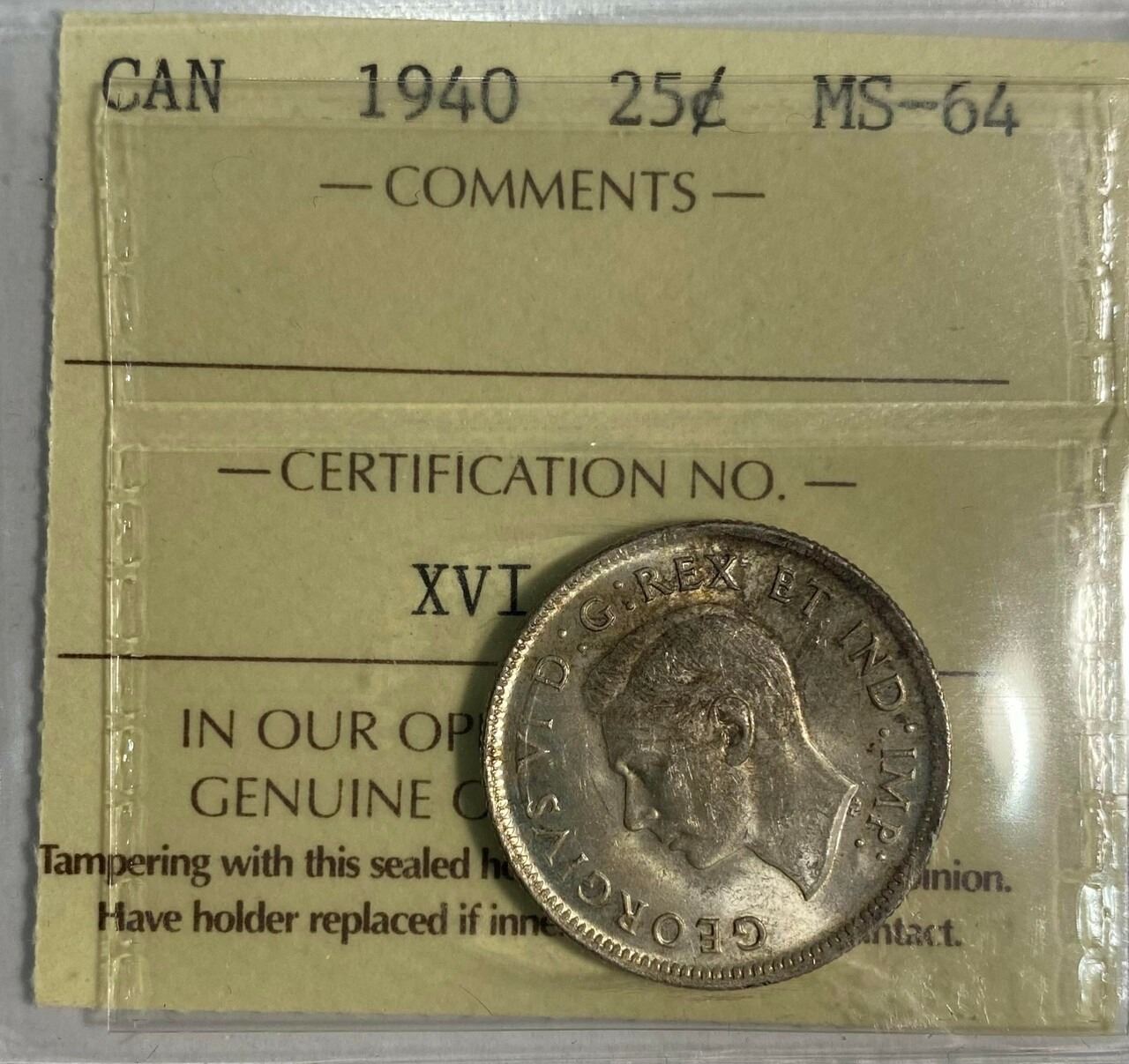 1940 Canada 25 Cent ICCS MS 64