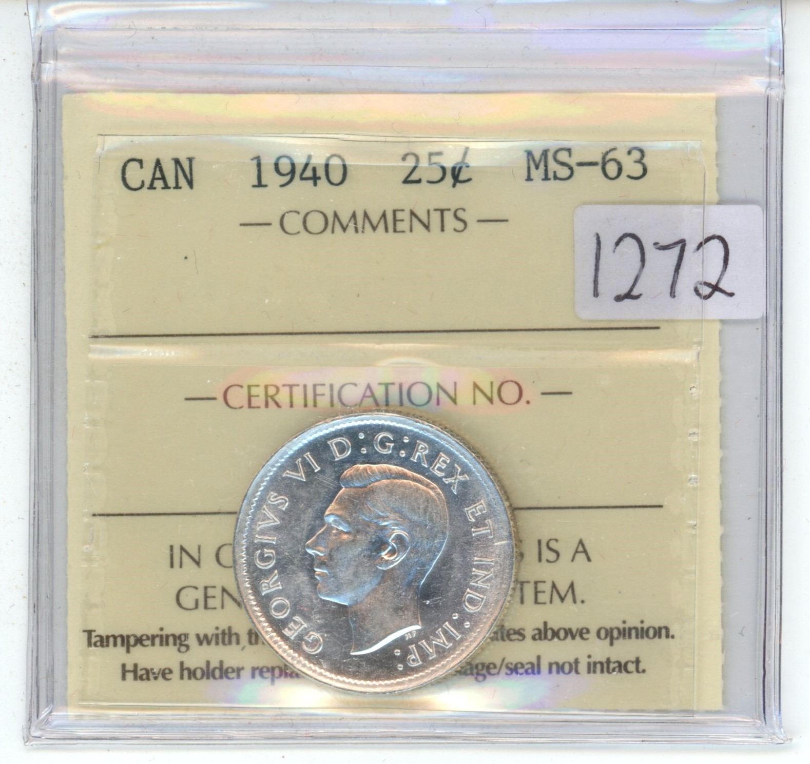 1940 Canadian graded silver, 25 cent coin - ICCS - MS63