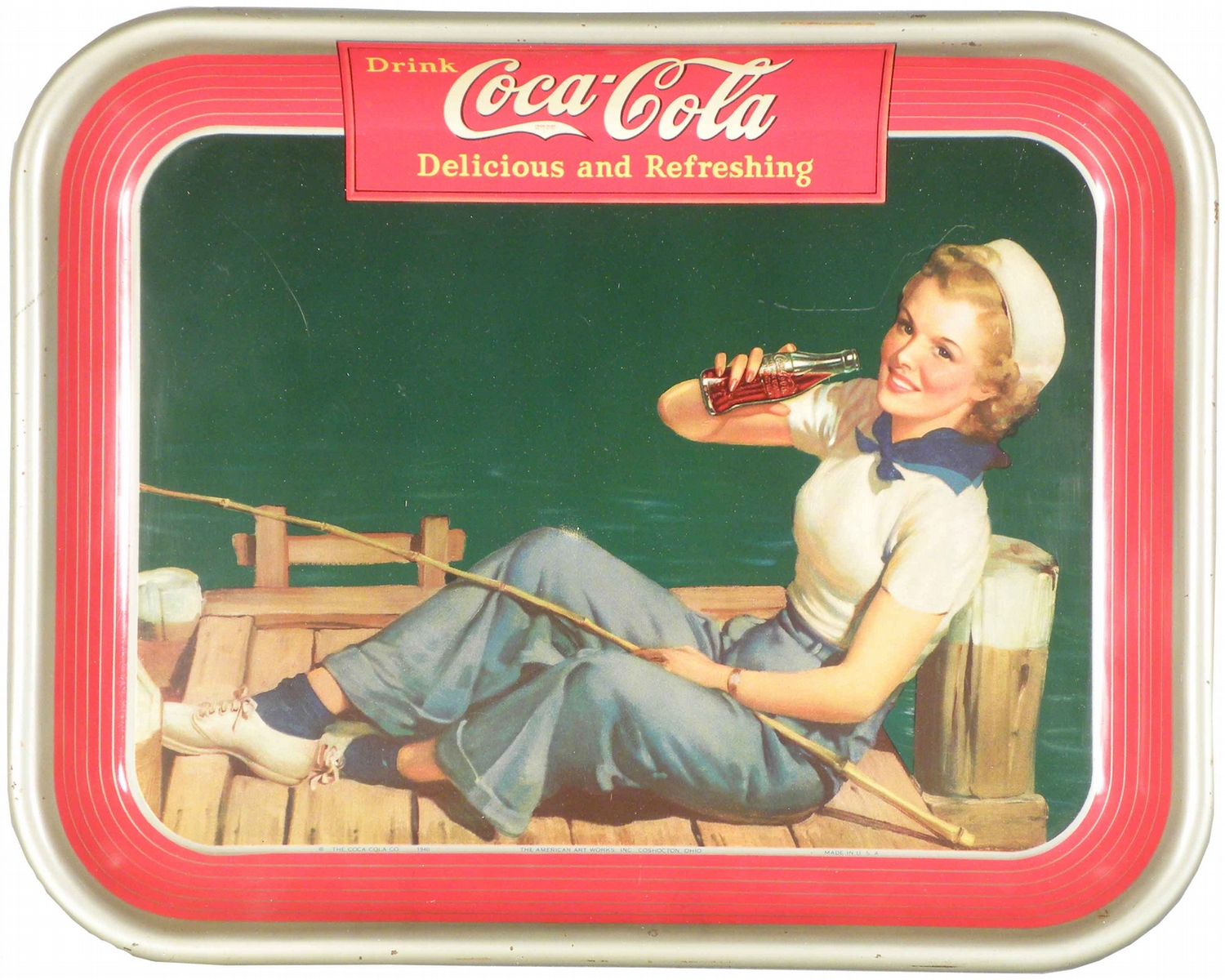 1940 Coca Cola Tin Serving Tray. Depicting girl on dock with fishing pole and coke. Very slight edge ware and surface scratches otherwise excellent condition. 10 1/2 X 13 inches.