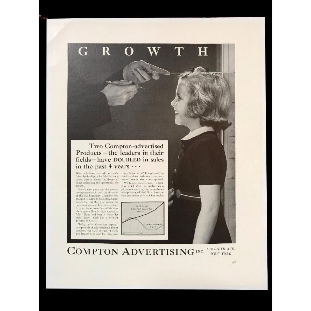 Original 1940 magazine ad for Compton Advertising Inc. 630 Fifth Ave. New York. "Growth". 11" X 14" mounted on archival linen canvas for perservation.