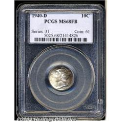 <B>1940-D<10C> MS68 Full Bands PCGS.</B></I> A few blushes of mottled, multicolored patina on portions of each side are the only visible alteration in this coin's pristine appearance from the time of striking. Despite a preponderance of Gems, this outstanding representative has few peers. Population: 16 in 68, 0 finer (7/04). <BR><BR><B>Important notice:</B> Heritage usually auctions material at the rate of 200-250 lots per hour. On some occasions eBay Live bid software or the Internet may not be able to keep up with the pace of the auction. We recommend placing a realistic absentee bid now as insurance to avoid disappointment. Occasionally the auctioneer may eliminate or reject an eBay Live bid, and the auctioneer may also reopen a lot after the close of the eBay live bidding (usually because we missed an audience bid), and may reject your bid even if it shows you as the winning bidder. By bidding via eBay Live, you agree that Heritage may award the lot to another bidder at its sole discretion under the circumstances described above or any other reasonable circumstances. Since eBay bids are not shown to us until we open the lot on the floor, we treat those bids just like floor bids. In most cases the floor responds before the eBay bid is presented to us, due to Internet lag time, so for consistency we have made it a policy that floor bids are always considered first over tie eBay live bids. Also please note that all Heritage lots purchased through eBay Live carry a 20% Buyer's Premium. Please make sure you read the Terms and Conditions before you bid. </span></font></tr></table></td></tr></table>