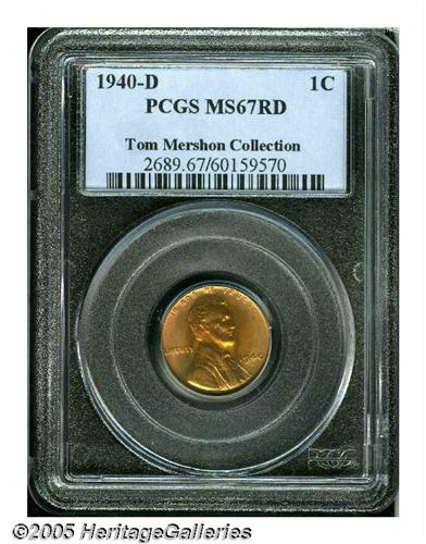 <B>1940-D<1C> MS67 Red PCGS.</B></I> Glowing red surfaces with a sharp strike and a minor contact mark on the reverse.<BR><I>From The Tom Mershon #2 All-Time PCGS Registry Set of Lincoln Wheat Cents.</B></I>