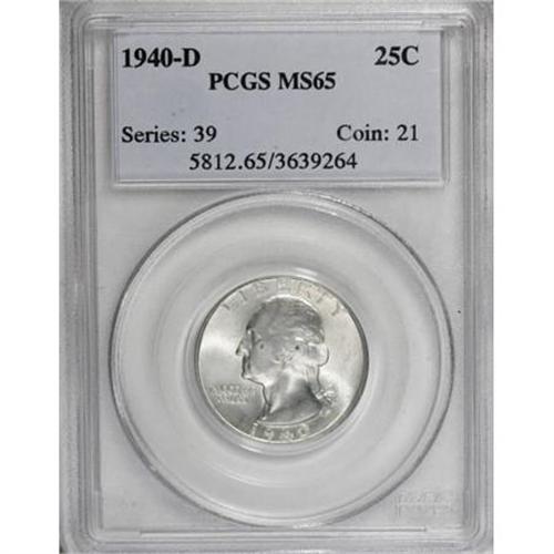 <B>1940-D 25C MS65 PCGS.</B></I> PCGS Population (586/296). NGC Census: (291/276). Mintage: 2,797,600. Numismedia Wsl. Price for NGC/PCGS coin in MS65: $252. (#5812)<BR><BR><B>Coin Engraver:</B> John Flanagan<BR><BR><b>Shipping:</b> Coins & Currency (<a target="_blank" href="http://www.heritageauctions.com/common/shipping.php">view shipping information</a>)