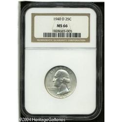 1940-D 25C MS66 NGC. Boldly struck with a coating <B>1940-D 25C MS66 NGC.</B></I> Boldly struck with a coating of creamy, milky patina over both sides of the coin, and smooth surfaces that seem mark-free on obverse and reverse alike. A lovely premium Gem. Population: 190 in 66, 33 finer (11/04). <BR><BR><B>Important notice:</B> Heritage usually auctions material at the rate of 200-250 lots per hour. On some occasions eBay Live bid software or the Internet may not be able to keep up with the pace of the auction. We recommend placing a realistic absentee bid now as insurance to avoid disappointment. Occasionally the auctioneer may eliminate or reject an eBay Live bid, and the auctioneer may also reopen a lot after the close of the eBay live bidding (usually because we missed an audience bid), and may reject your bid even if it shows you as the winning bidder. By bidding via eBay Live, you agree that Heritage may award the lot to another bidder at its sole discretion under the circumstances described above or any other reasonable circumstances. Since eBay bids are not shown to us until we open the lot on the floor, we treat those bids just like floor bids. In most cases the floor responds before the eBay bid is presented to us, due to Internet lag time, so for consistency we have made it a policy that floor bids are always considered first over tie eBay live bids. Also please note that all Heritage lots purchased through eBay Live carry a 20% Buyer's Premium. Please make sure you read the Terms and Conditions before you bid. This lot is being auctioned in conjunction with a live floor auction by Heritage Galleries & Auctioneers. All final auction and invoice information will be supplied by Heritage Galleries & Auctioneers, and all other information should be considered preliminary. Lot:6004