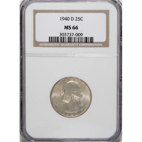 <B>1940-D 25C MS66 NGC.</B></I> NGC Census: (240/37). PCGS Population (266/18). Mintage: 2,797,600. Numismedia Wsl. Price for NGC/PCGS coin in MS66: $360. (#5812)<BR><BR><B>Coin Engraver:</B> John Flanagan<BR><BR><b>Shipping:</b> Coins & Currency (<a target="_blank" href="http://www.heritageauctions.com/common/shipping.php">view shipping information</a>)