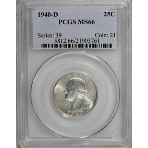<B>1940-D 25C MS66 PCGS.</B></I> PCGS Population (262/18). NGC Census: (236/37). Mintage: 2,797,600. Numismedia Wsl. Price for NGC/PCGS coin in MS66: $360. (#5812)<BR><BR><B>Coin Engraver:</B> John Flanagan<BR><BR><b>Shipping:</b> Coins & Currency (<a target="_blank" href="http://www.heritageauctions.com/common/shipping.php">view shipping information</a>\)