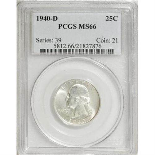 <B>1940-D 25C MS66 PCGS.</B></I> . PCGS Population (288/18). NGC Census: (239/37). Mintage: 2,797,600. Numismedia Wsl. Price for NGC/PCGS coin in MS66: $370. (#5812)<BR><BR><B>Coin Engraver:</B> John Flanagan<BR><BR><b>Shipping:</b> Coins & Currency (<a target="_blank" href="http://www.heritageauctions.com/common/shipping.php">view shipping information</a>)