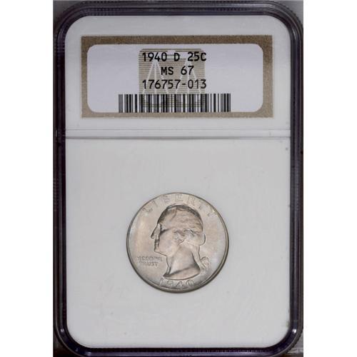<B>1940-D<25C> MS67 NGC.</B></I> This remarkably preserved Superb Gem is draped in medium lilac, gold, and sky-blue. The lustrous surfaces approach perfection, except for the usual slight incompleteness of strike on the legends close to the rims. IN GOD WE TRUST is lightly die doubled. Census: 35 in 67, 1 finer (1/06).<BR><I>From The Houston Collection of Washington Quarters.</B></I>