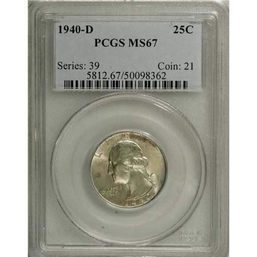 <B>1940-D 25C MS67 PCGS.</B></I> The smooth sky-blue surfaces also display dollops of olive-brown toning, particularly near the borders. This lower mintage Superb Gem has impressive eye appeal, and the strike is decisive apart from mild softness on the lower half of the date. Population: 18 in 67, 0 finer (1/07).<BR><BR><b>Shipping:</b> Coins & Currency (<a target="_blank" href="http://www.heritageauctions.com/common/shipping.php">view shipping information</a>)