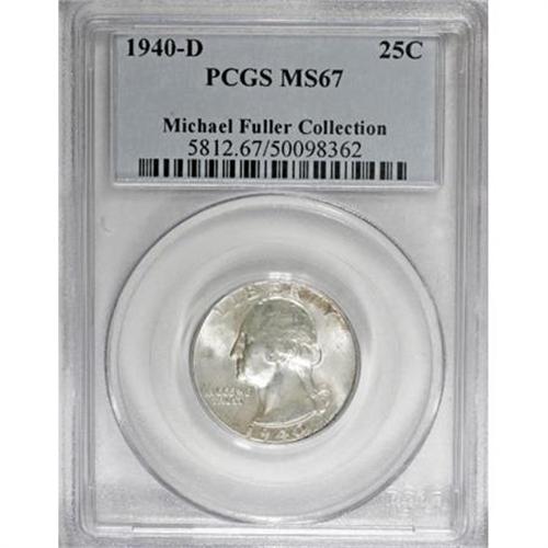 <B>1940-D 25C MS67 PCGS.</B></I> The smooth ice-blue surfaces also display dollops of olive-brown toning, particularly near the borders. This lower mintage Superb Gem has impressive eye appeal, and the strike is decisive apart from mild softness on the lower half of the date. Population: 18 in 67, 0 finer (10/07).<BR><I>From The Michael Fuller Collection.</B></I><BR><BR><B>Coin Engraver:</B> John Flanagan<BR><BR><b>Shipping:</b> Coins & Currency (<a target="_blank" href="http://www.heritageauctions.com/common/shipping.php">view shipping information</a>)