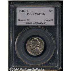 <B>1940-D<5C> MS67 Full Steps PCGS.</B></I> A film of light-gold interspersed with blushes of sky-blue bathe the pristine surfaces on either side. Six steps are strongly defined on this marvelous specimen. Population: 41 in 67, 0 finer (3/04). <BR><BR><B>Important notice:</B> Heritage usually auctions material at the rate of 200-250 lots per hour. On some occasions eBay Live bid software or the Internet may not be able to keep up with the pace of the auction. We recommend placing a realistic absentee bid now as insurance to avoid disappointment. Occasionally the auctioneer may eliminate or reject an eBay Live bid, and the auctioneer may also reopen a lot after the close of the eBay live bidding (usually because we missed an audience bid), and may reject your bid even if it shows you as the winning bidder. By bidding via eBay Live, you agree that Heritage may award the lot to another bidder at its sole discretion under the circumstances described above or any other reasonable circumstances. Since eBay bids are not shown to us until we open the lot on the floor, we treat those bids just like floor bids. In most cases the floor responds before the eBay bid is presented to us, due to Internet lag time, so for consistency we have made it a policy that floor bids are always considered first over tie eBay live bids. Also please note that all Heritage lots purchased through eBay Live carry a 20% Buyer's Premium. Please make sure you read the Terms and Conditions before you bid.