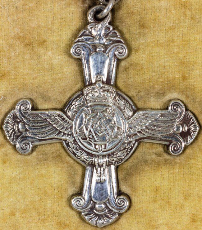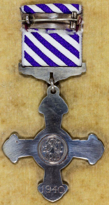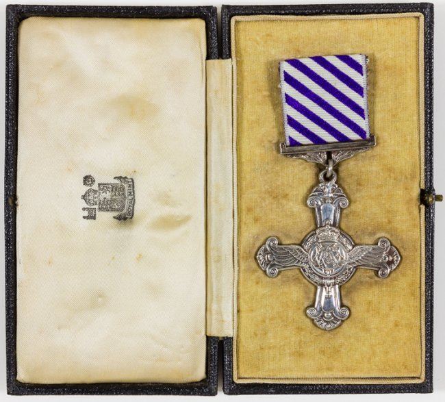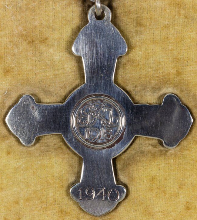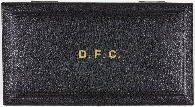 Rare and most desirable cased British Distinguished Flying Cross ("D.F.C."), issued in 1940 and very likely awarded to a pilot or airman who had participated in the decisive Battle of Britain. The cross bears two spread feathered wings, with a roundel at center above laurel leaf wreaths. At the center of the roundel is the RAF monogram surmounted by the Imperial Crown. On the reverse, the cross has an encircled royal cypher above the year "1918", and at bottom the year the award was made, "1940", has also been engraved. A laurel-decorated mounting bar holds the 1 1/4" wide violet and white diagonally-striped ribbon. This example is unattributed, as was often the case, but is of exceptional rarity. Overall there were 20,000 awards of the D.F.C. during the war, but the vast majority of these were issued in 1944-45 for the bomber campaign against Germany. The D.F.C. for 1940 is very rare and seldom seen either as a single medal or in a group. In all, perhaps only 500 of these medals were awarded in 1940, and most were in recognition for gallantry exhibited during the Battle of Britain. Ex: The War Museum.