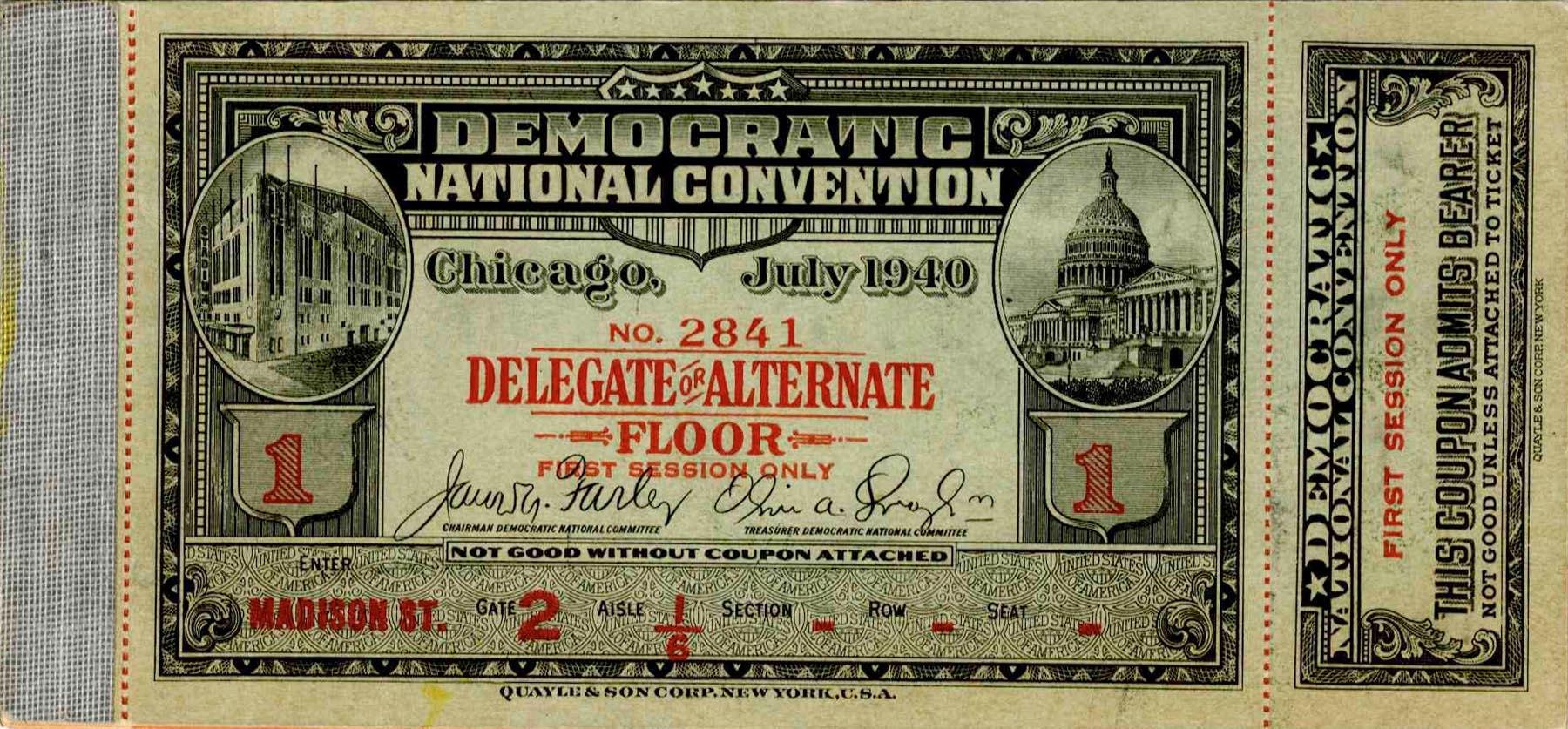 July 1940 United States Democratic National Convention in Chicago, ''Delegate or Alternate'' floor ticket. Convention took place in the midst of Franklin D. Roosevelt's three-term presidency. Vignettes on face of full ticket includes the Capitol Dome. Ornate vignette design on verso. Printing sharp and legible. Ticket, measuring 6.25'' x 3'', remains in excellent condition with only slight discoloration in places. Near fine.