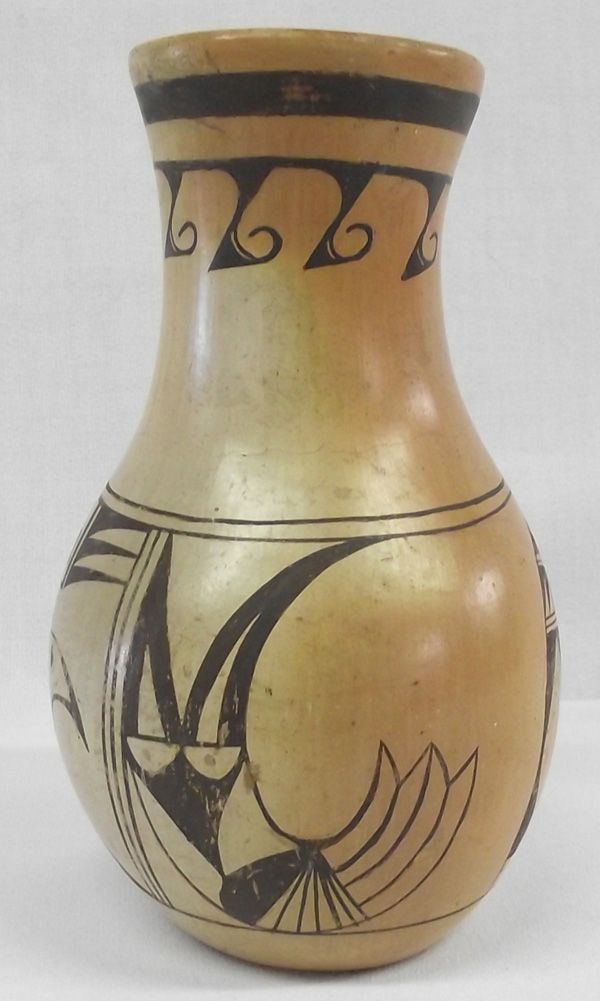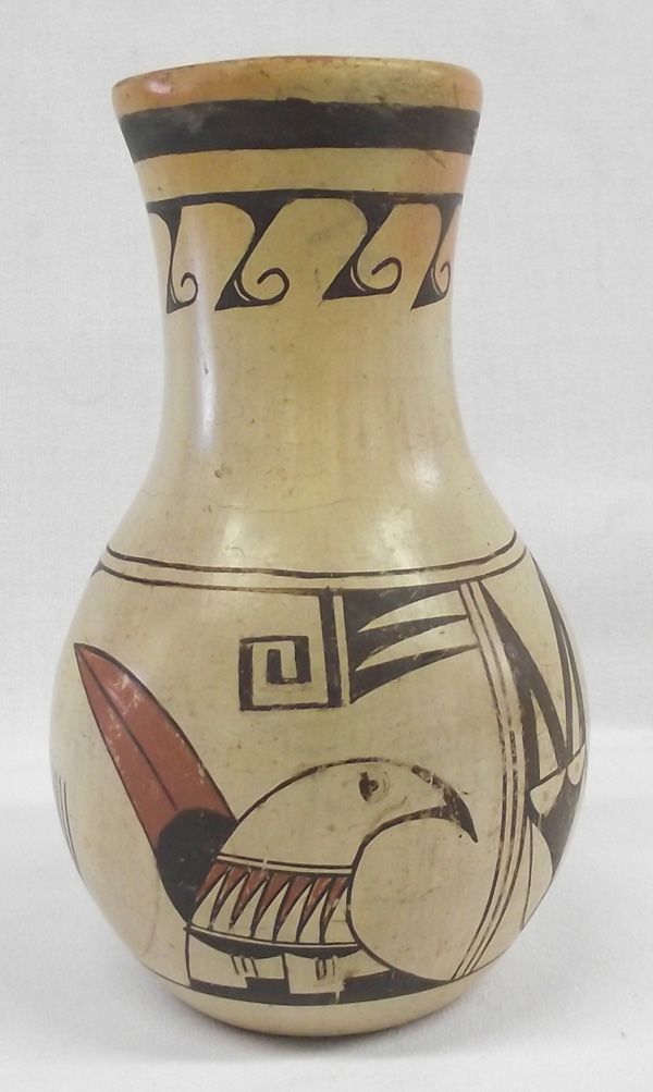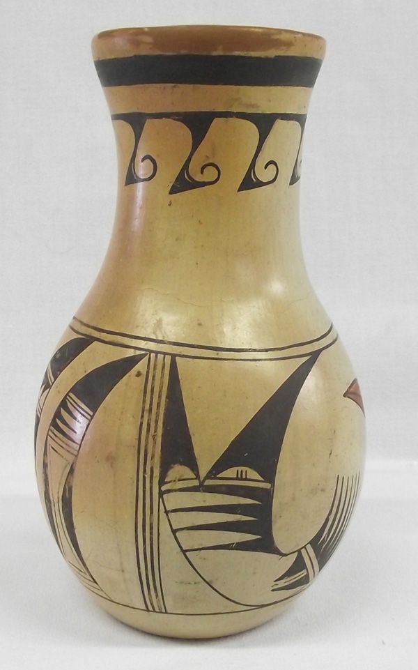 1940 Hopi Parrot Pottery Jar, heavy walled, with wind pattern under pulled spout on outside of jar. Crisp color, measures 6.25''H x 4.25''W. .25