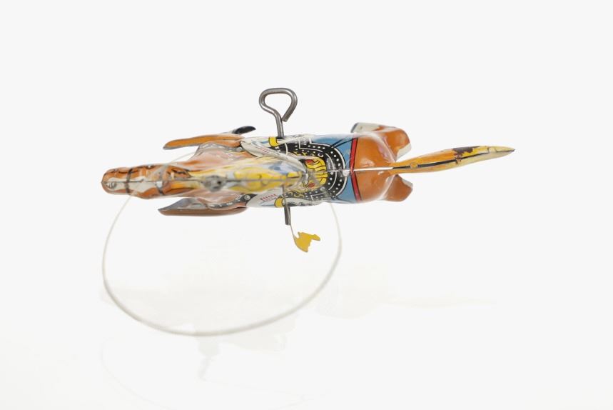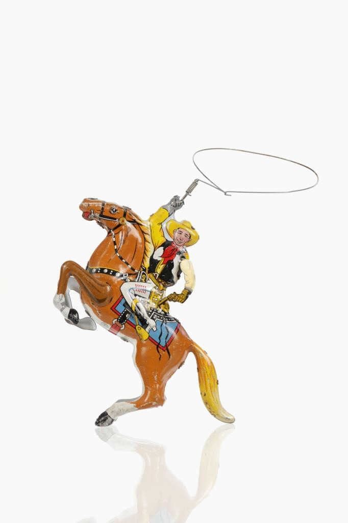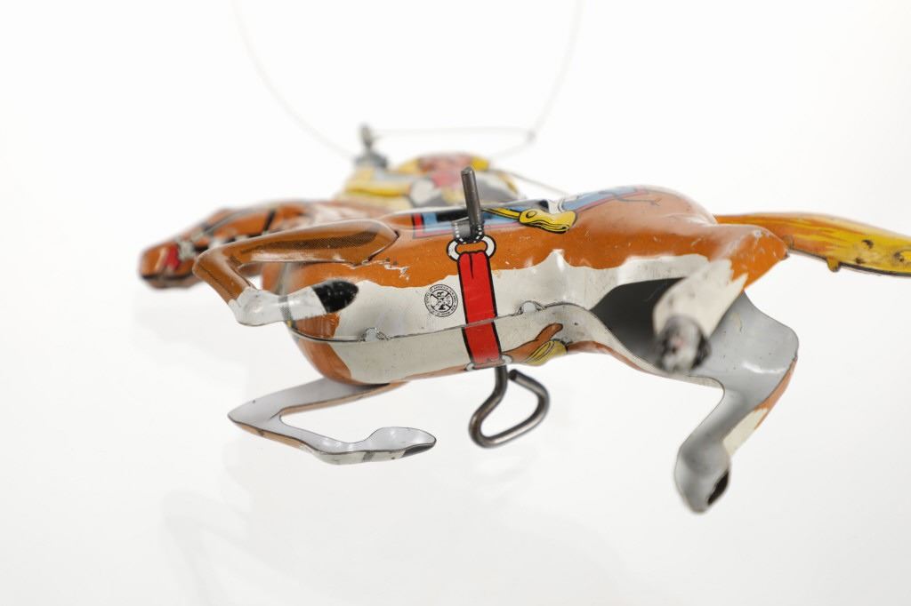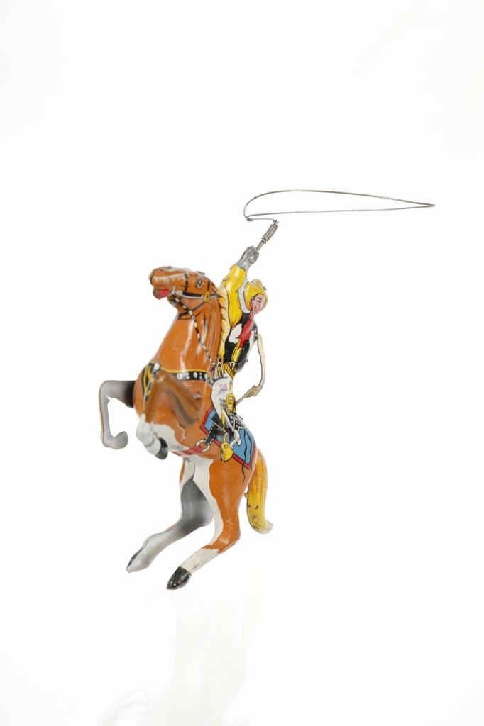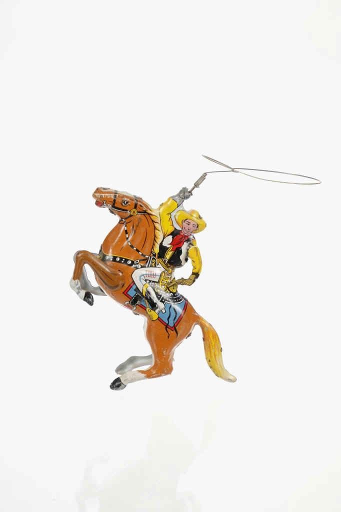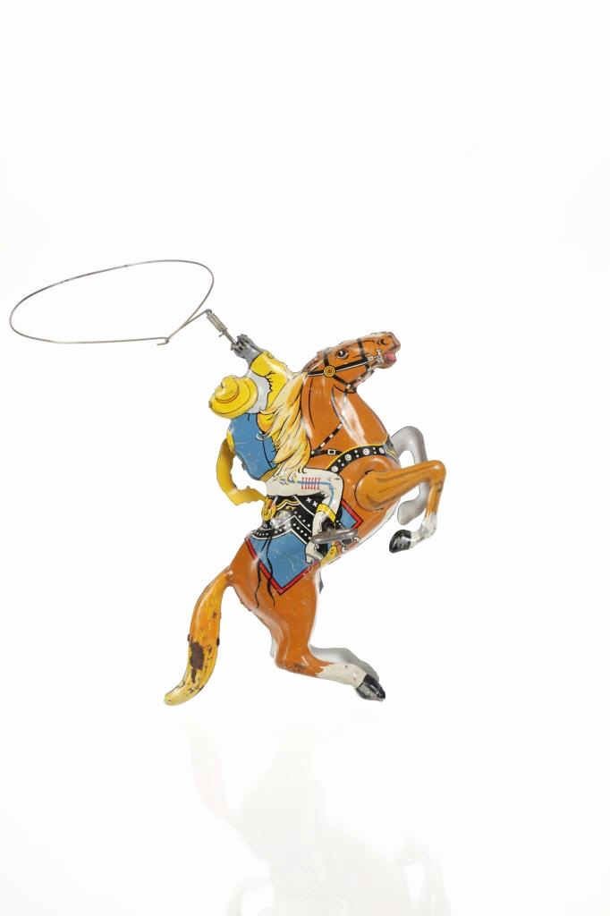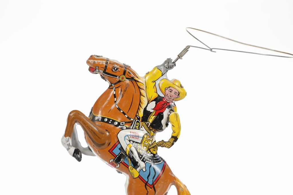 For your consideration is this 1940 Louis Marx & Company wind up cowboy toy titled, "Range Rider". Louis B. Marx, born on August 11, 1896, in Brooklyn, New York. In 1919, Marx founded Louis Marx & Company, paying toy makers to make goods for him until he bought production facilities in 1921. Marx created and produced a wide range of toys, and the business also enhanced and improved toys produced by other manufacturers before selling them at lower prices. Marx purchased manufacturing facilities in Erie, Girard, Pennsylvania, Glen Dale, West Virginia, and the nearby city of Wheeling in the early 1930s. An addition was constructed in 1948–1949 to facilitate the manufacture of plastic toys. In the 1940s and 1950s, Marx became the greatest toy manufacturer in the world due to the enormous Glen Dale factory, which produced more toys than any other Marx facility. At Glen Dale, four unions were active, and there were over 2,000 employees at the start of the 1960s. But, once Louis Marx sold the business to the Quaker Oats Corporation in April 1972, business began to decrease. In April 1976, Quaker sold to Dunbee-Combex Ltd. In January 1980, Glen Dale's 800 employees were laid off, and the renamed Dunbee-Combex-Marx shortly declared bankruptcy. Louis Marx passed away on February 5, 1982, at his home in Scarsdale, New York. The toy shows a cowboy in a yellow shirt and cowboy hat, a black and white vest, white pants, and white and black cowboy boots as his sits on his light brown horse swinging his lasso above his head. The horse is wearing harnesses and a blue and red blanket under the black and white saddle. The cowboy holds a revolver in his left hand. Looking at the horse head on, on the left side is a wind up key which moves the lasso around the cowboys head. The toy shows good condition overall with slight wear from its vintage age but is still in working order. The toy measures 7 3/4" L x 2 1/2" W x 5 1/4" H.
