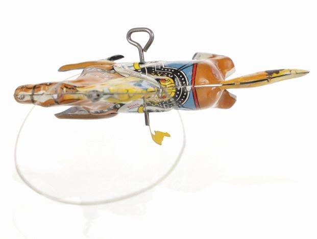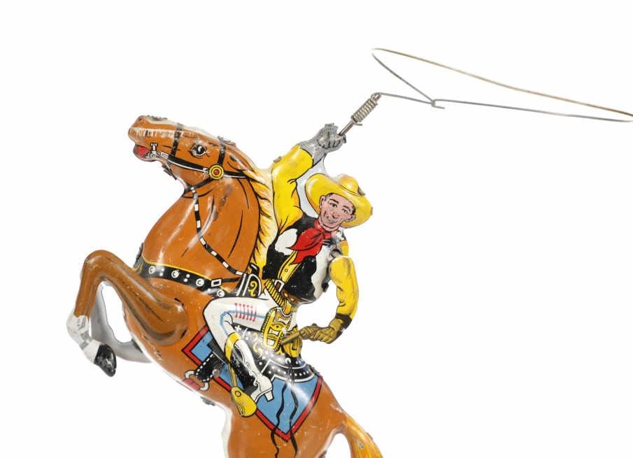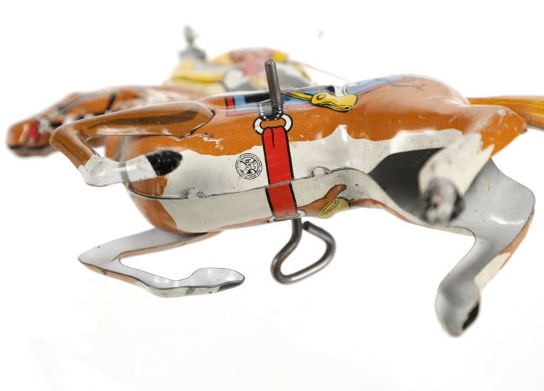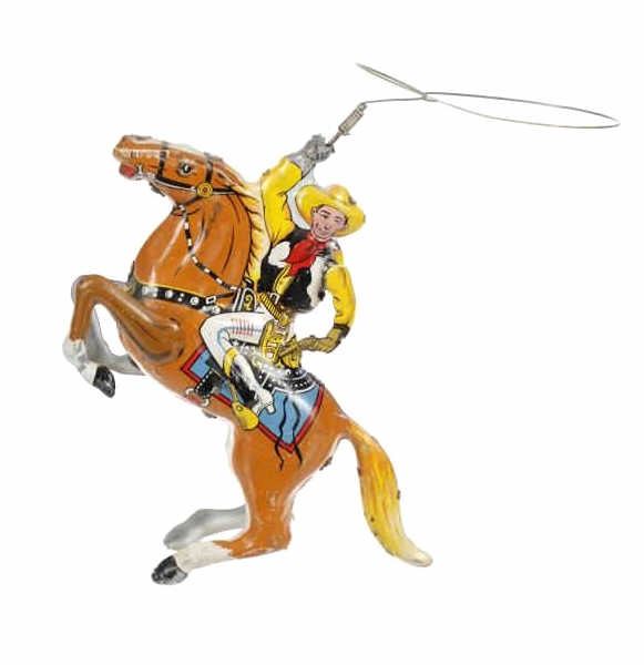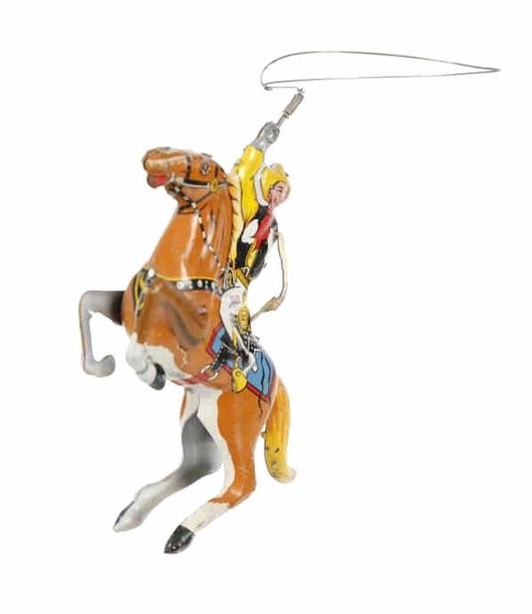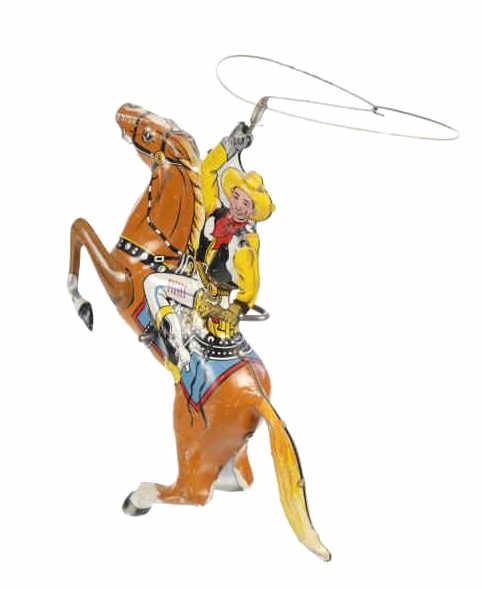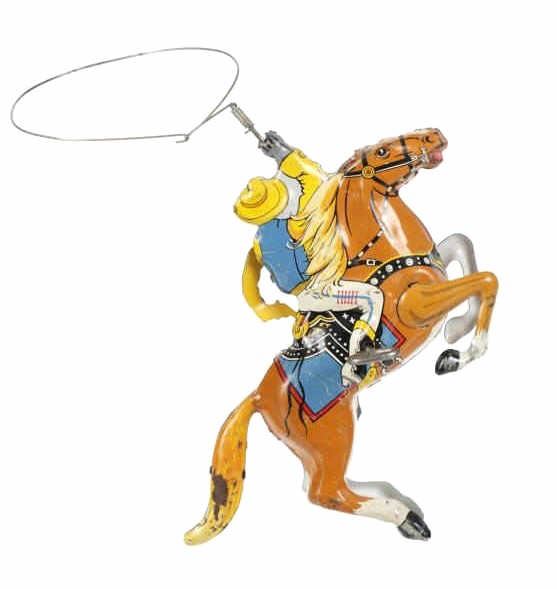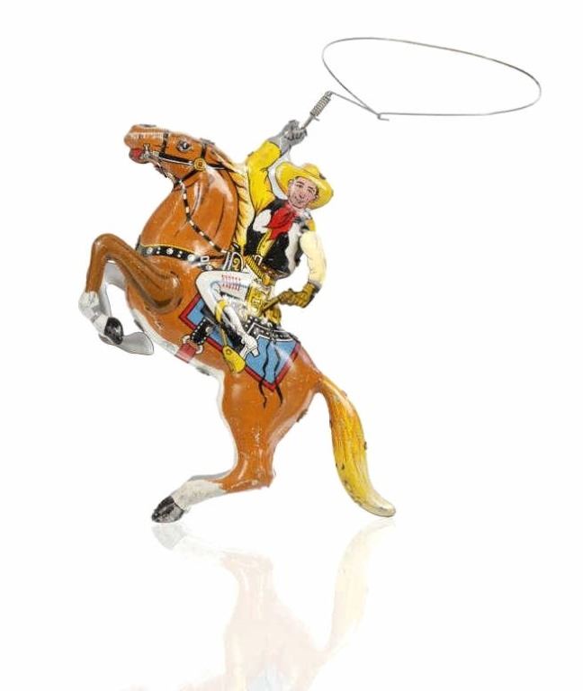 For your consideration is this 1940 Louis Marx & Company wind up cowboy toy titled, "Range Rider". Louis B. Marx, born on August 11, 1896, in Brooklyn, New York. In 1919, Marx founded Louis Marx & Company, paying toy makers to make goods for him until he bought production facilities in 1921. Marx created and produced a wide range of toys, and the business also enhanced and improved toys produced by other manufacturers before selling them at lower prices. Marx purchased manufacturing facilities in Erie, Girard, Pennsylvania, Glen Dale, West Virginia, and the nearby city of Wheeling in the early 1930s. An addition was constructed in 1948–1949 to facilitate the manufacture of plastic toys. In the 1940s and 1950s, Marx became the greatest toy manufacturer in the world due to the enormous Glen Dale factory, which produced more toys than any other Marx facility. At Glen Dale, four unions were active, and there were over 2,000 employees at the start of the 1960s. But, once Louis Marx sold the business to the Quaker Oats Corporation in April 1972, business began to decrease. In April 1976, Quaker sold to Dunbee-Combex Ltd. In January 1980, Glen Dale's 800 employees were laid off, and the renamed Dunbee-Combex-Marx shortly declared bankruptcy. Louis Marx passed away on February 5, 1982, at his home in Scarsdale, New York. The toy shows a cowboy in a yellow shirt and cowboy hat, a black and white vest, white pants, and white and black cowboy boots as his sits on his light brown horse swinging his lasso above his head. The horse is wearing harnesses and a blue and red blanket under the black and white saddle. The cowboy holds a revolver in his left hand. Looking at the horse head on, on the left side is a wind up key which moves the lasso around the cowboys head. The toy shows good condition overall with slight wear from its vintage age but is still in working order. The toy measures 7 3/4" L x 2 1/2" W x 5 1/4" H.
