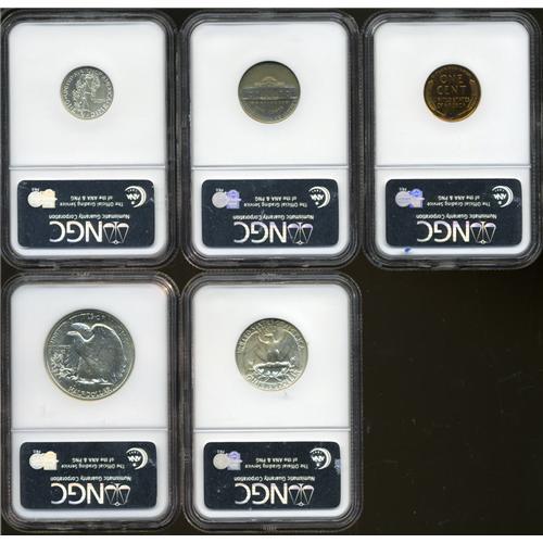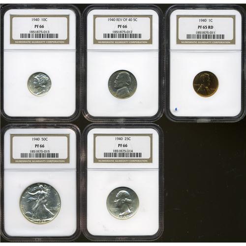 <B>1940 Proof Set PR65 to PR66 NGC.</B></I> The set includes: <B>cent PR65 Red,</B></I> boldly struck, flashy, and original; <B>nickel Reverse of 1949 PR66,</B></I> hazy with a crescent of reddish-gold toning at the bottom of the obverse with similar toning in the upper obverse field; <B>dime PR66,</B></I> moderately reflective beneath faint haze; <B>quarter PR66,</B></I> hints of champagne and rose patina on each side; and a <B>half PR66,</B></I> deeply mirrored and largely untoned.