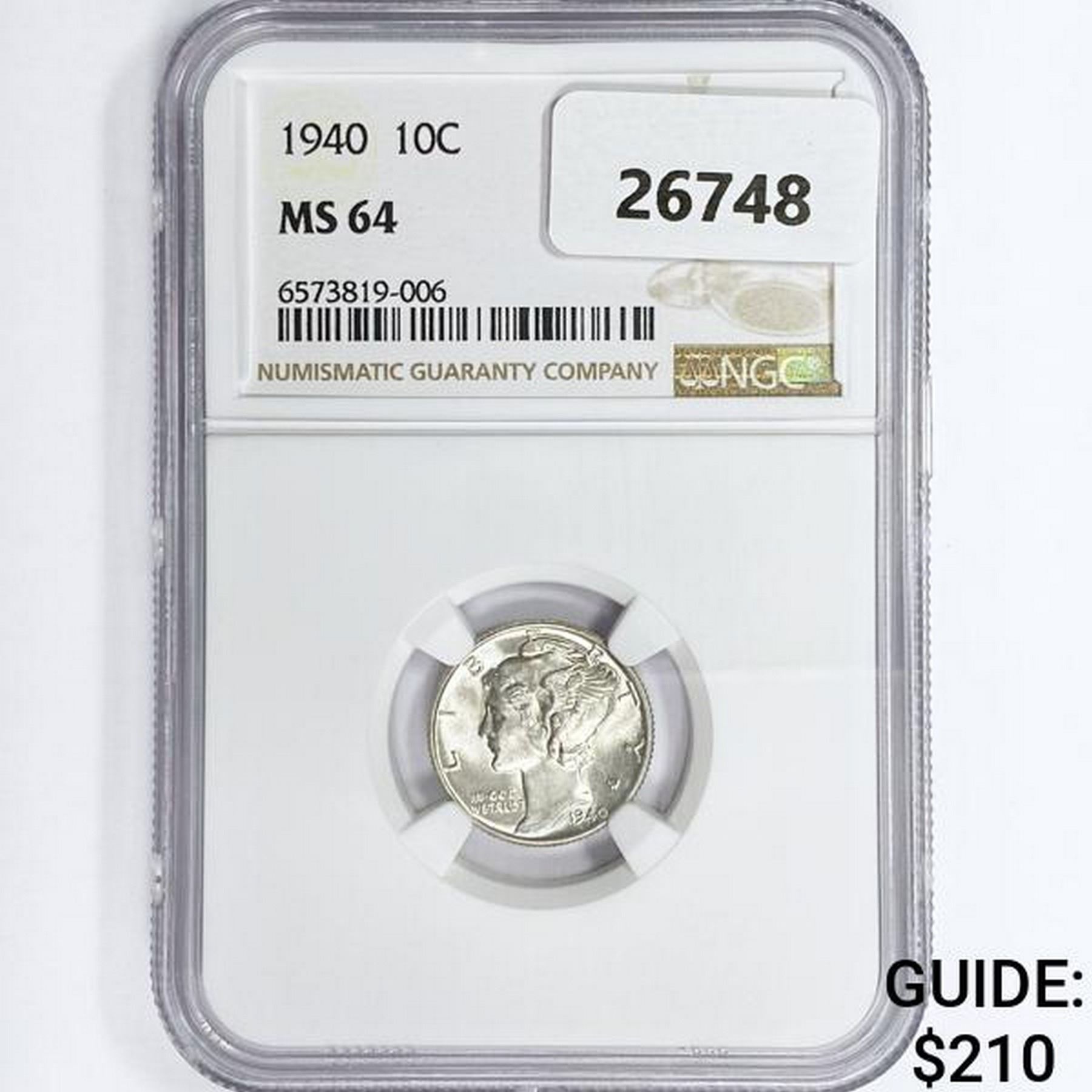 1940 Mercury Silver Dime NGC MS64