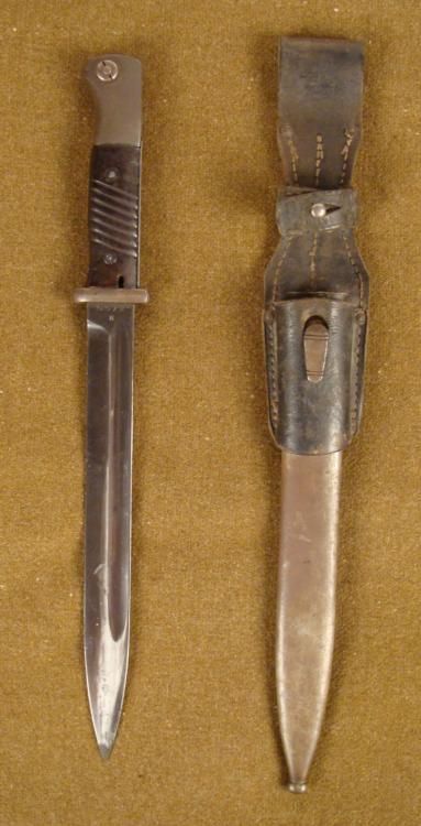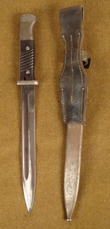1940 NAZI K98 COMBAT BAYONET FOR MAUSER RIFLE WITH FROG-BY E.F. HORSTER * * NICE LOOKING WWII 98K MAUSER RIFLE COMBAT BAYONET WITH LEATHER FROG--NICE BLADE WITH THE SPINE MARKED/DATED 1940--RICASSO MAKER MARKED E.U.F. HORSTER-REVERSE MARKED "6572N"-NICE BAKELITE GRIPS-POMMEL IS WAFFENAMT AND RELEASE BUTTON WORKS FINE-STEEL SCABBARD * MARKED 3380--ORIGINAL LEATHER FROG IN GOOD CONDITION WITH MAKER/WEHRMACHT CONTROL NUMBERS ON REVERSE. *