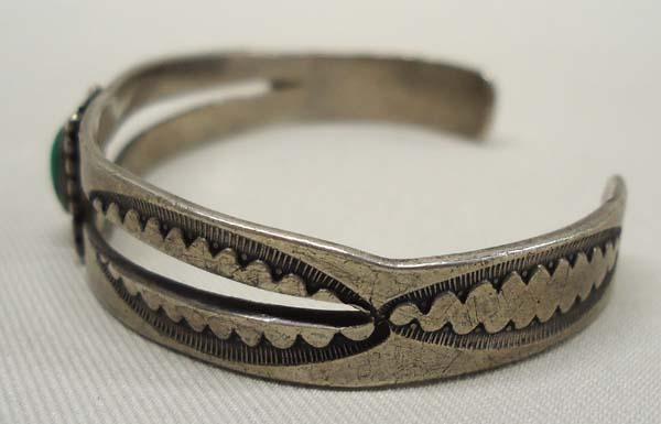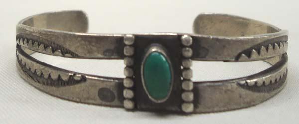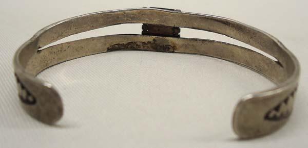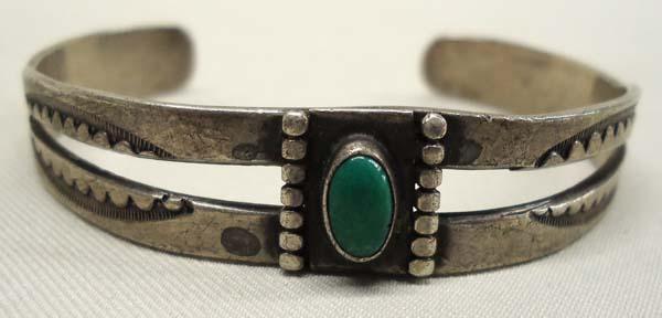 1940 Native American Navajo Bracelet. Split band, silver and turquoise. Measurement in Inches - Inside Length(Including Opening) 5 1/2'' x 1/3'' Width. Buyers Pay Actual Shipping and Handling Charges(see terms and conditions for more information).