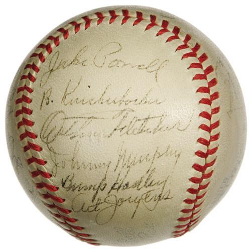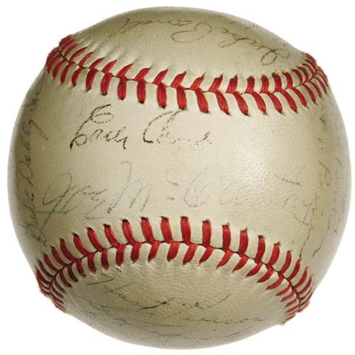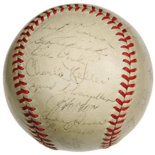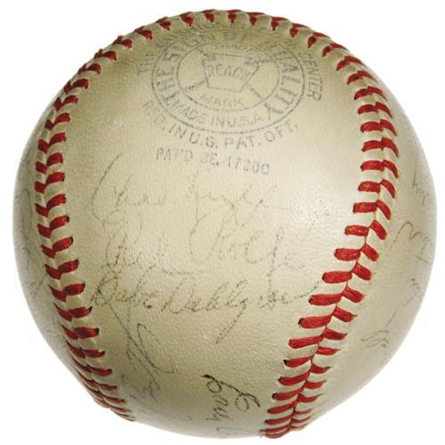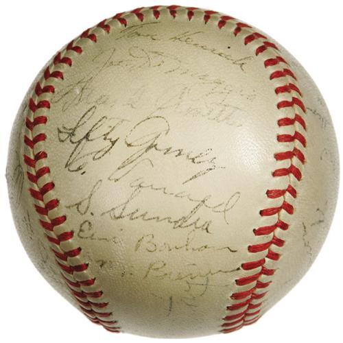 <B>1940 New York Yankees Team Signed Baseball.</B></I> Though the Yanks found themselves in the rare role of spectators for the 1940 World Series, there's no denying the outrageous talent that filled the Bronx dugout this year. Most are present on this OAL (Harridge) ball offering twenty-seven black ink autographs, notably DiMaggio, Dickey, Gomez, Combs, McCarthy, Ruffing, Henrich, Dahlgren and Crosetti. Autograph quality ranges from 5/10 to 9/10, with most firmly at the center of that range. The ball itself is clean and without noteworthy flaws. <I>LOA from PSA/DNA. LOA from James Spence Authentication.</B></I><BR><BR><b>Shipping:</b> Balls, Pucks, etc., Small (<a target="_blank" href="http://www.heritageauctions.com/common/shipping.php">view shipping information</a>)