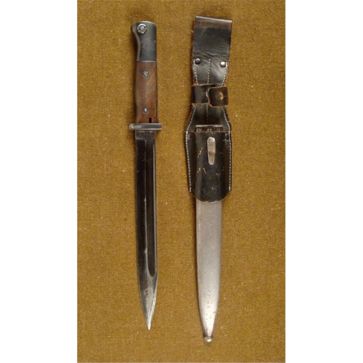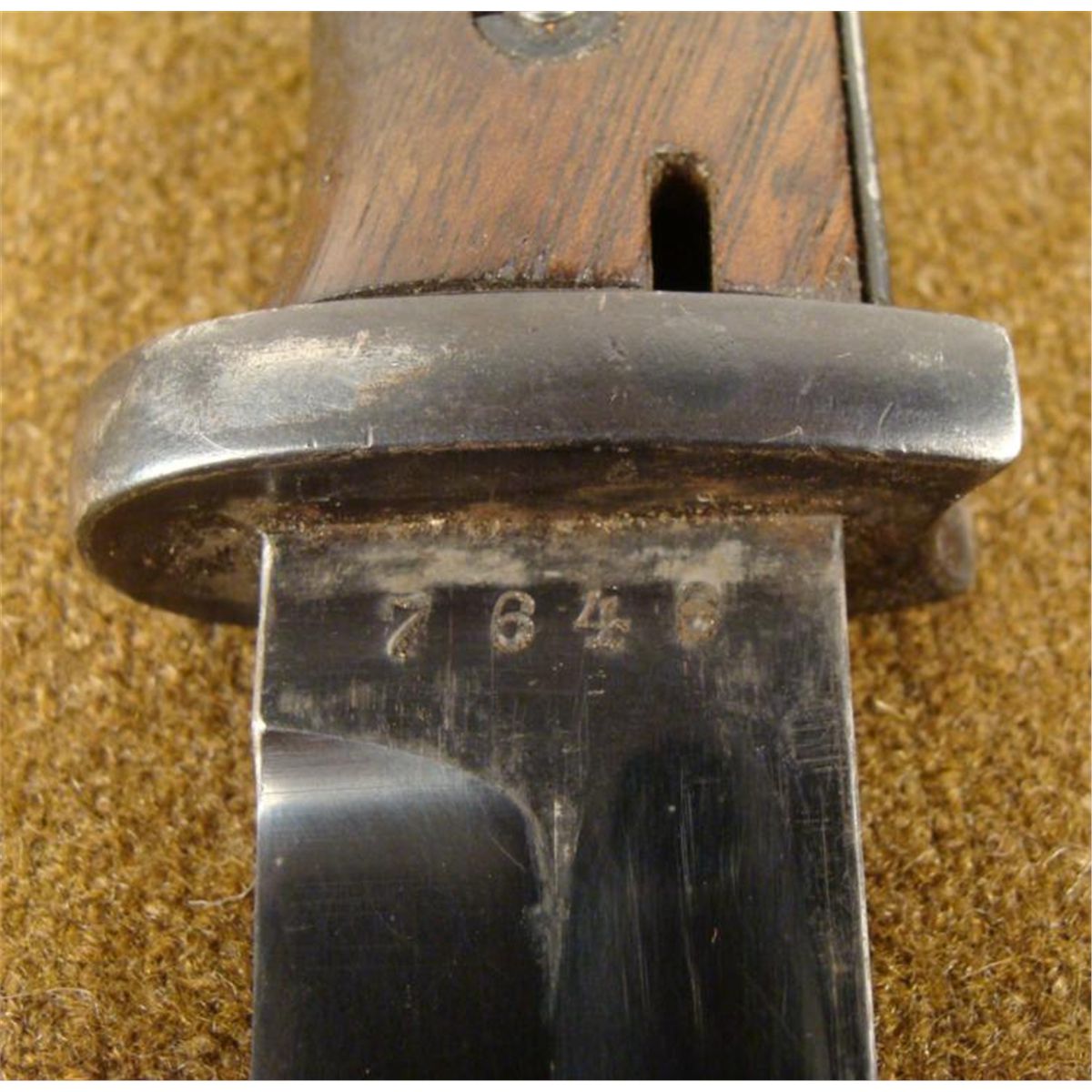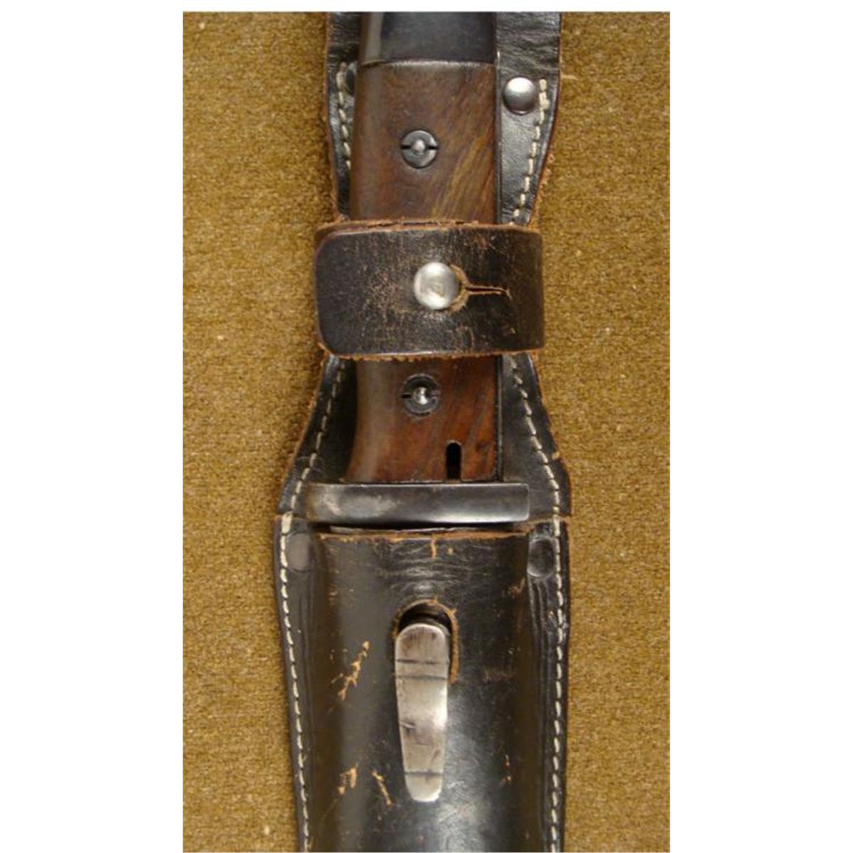 OFFERED HERE IS AN ORIGINAL K98 NAZI COMBAT BAYONET WITH LEATHER FROG.-MARKED AND DATED 1940 * THIS IS A FINE COMBAT BAYONET, WITH EXCELLENT WOOD GRIPS. IT HAS A BLUED EAGLE HEAD POMMEL WITH A "855" WAFFENAMT. THE RELEASE BUTTON WORKS FINE. IT HAS A NICE BLADE, THAT HAS ABOUT 80% ORIGINAL BLUEING. ON THE RICASSO IT IS MARKED "J. SCH.". ON THE REVERSE IT IS MARKED "7646". THE BLADE SPINE IS DATED "40". THE STEEL SCABBARD SHOWS AGE AND IS UNMARKED. THE BAYONET HAS A NICE SUPPLE ORIGINAL LEATHER SCABBARD WITH A STRAP AND NUB CLOSURE. * *