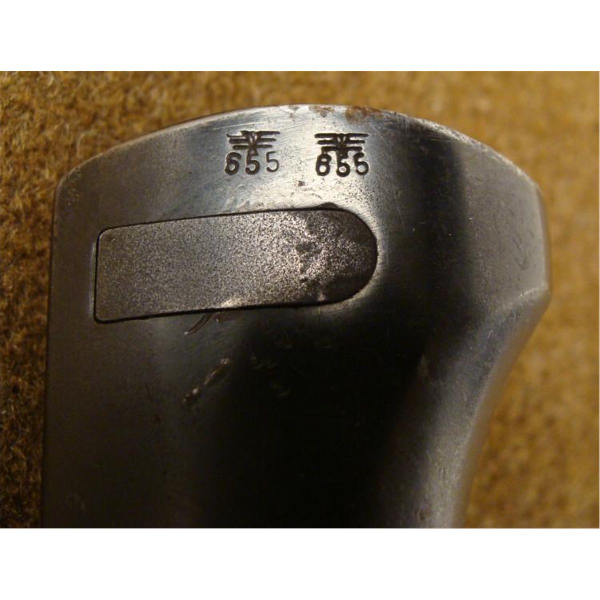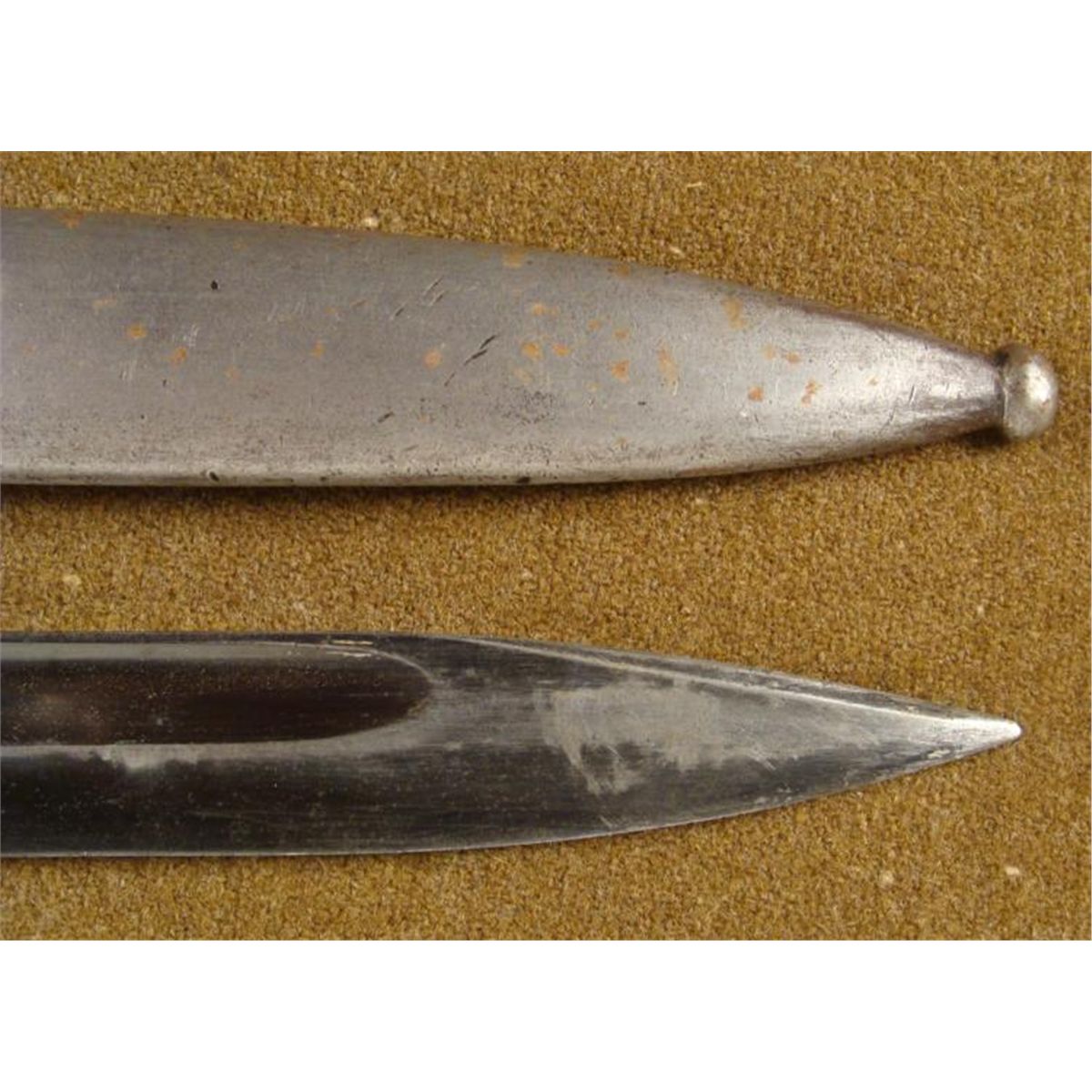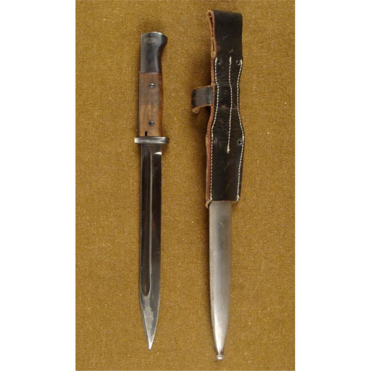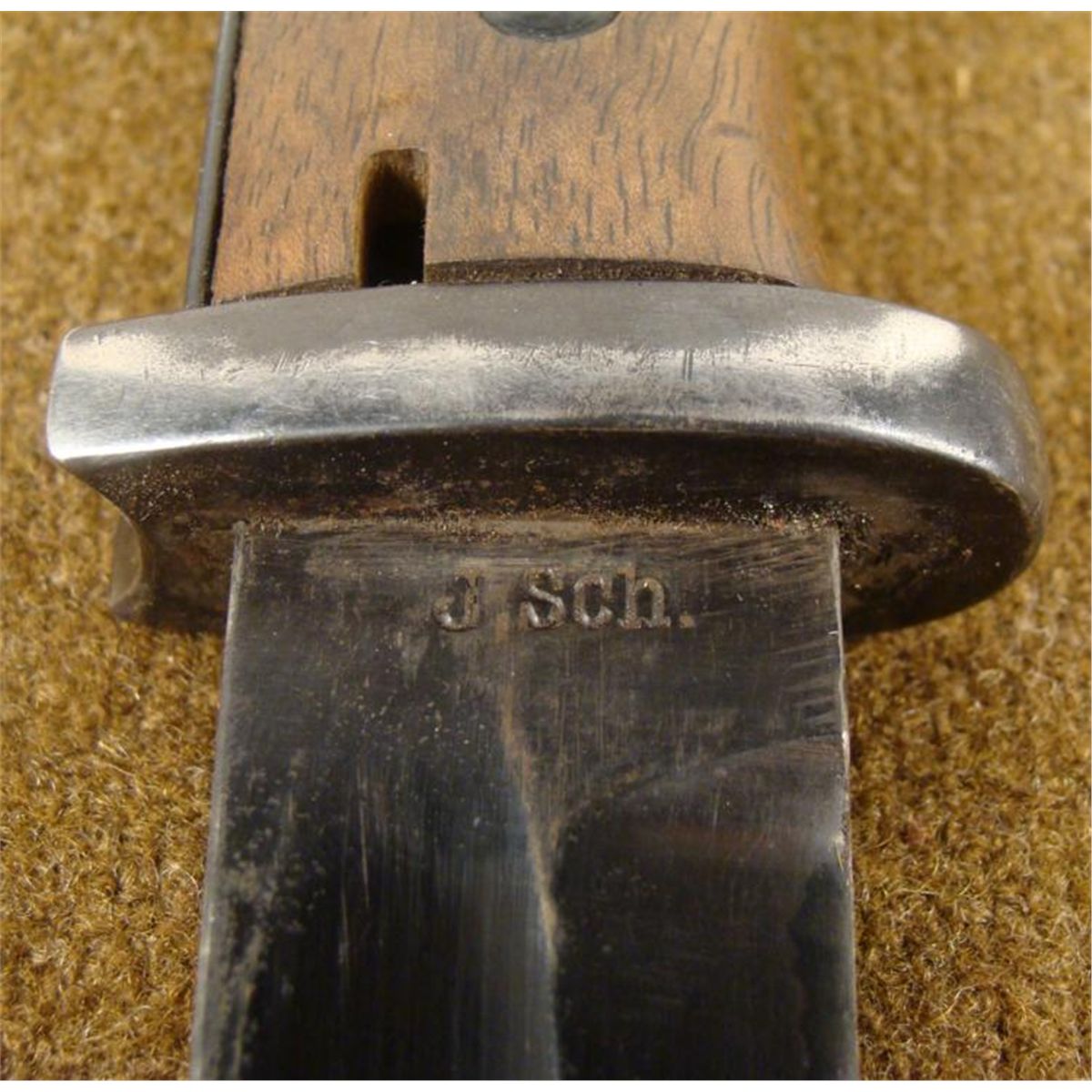 OFFERED HERE IS AN ORIGINAL K98 NAZI COMBAT BAYONET WITH LEATHER FROG.-MARKED AND DATED 1940 * THIS IS A FINE COMBAT BAYONET, WITH EXCELLENT WOOD GRIPS. IT HAS A BLUED EAGLE HEAD POMMEL WITH A "855" WAFFENAMT. THE RELEASE BUTTON WORKS FINE. IT HAS A NICE BLADE, THAT HAS ABOUT 80% ORIGINAL BLUEING. ON THE RICASSO IT IS MARKED "J. SCH.". ON THE REVERSE IT IS MARKED "7646". THE BLADE SPINE IS DATED "40". THE STEEL SCABBARD SHOWS AGE AND IS UNMARKED. THE BAYONET HAS A NICE SUPPLE ORIGINAL LEATHER SCABBARD WITH A STRAP AND NUB CLOSURE. * *