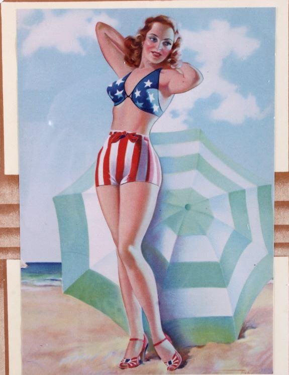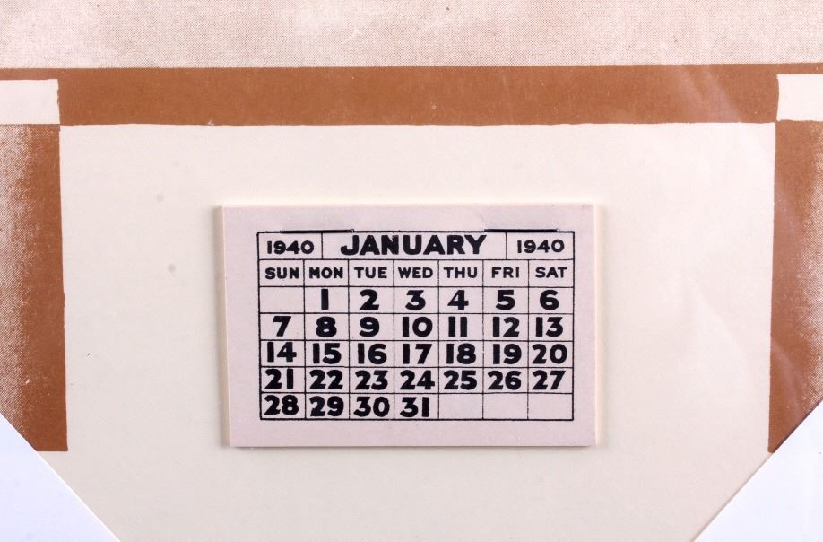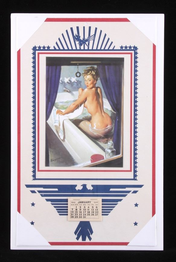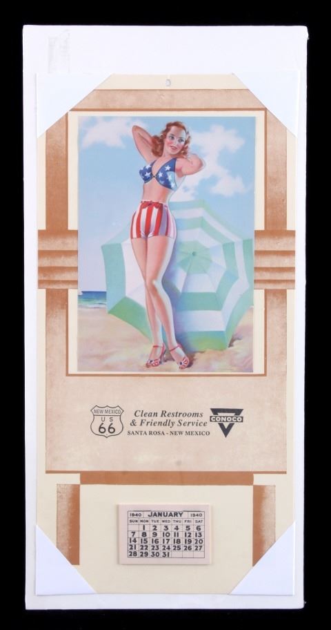 This is a pair of 1940 pinup girl calendars. One of the calendars features the artwork of Gil Elvgren, a well known pinup artist from that era. The other calendar is marked "Conoco Santa Rosa New Mexico". Both calendars are in good condition. The larger piece measures 10" x 16.5".