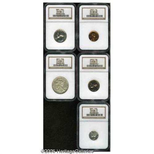 <B>1940 Proof Set PR65 to PR66 NGC.</B></I> The set includes: <B>Cent PR65 Red,</B></I> fire-red, gold, and peach colors; <B>Nickel PR65,</B></I> a needle-sharp strike, apricot and plum colors, a few carbon flecks; <B>Dime PR65,</B></I> brilliant, bold, and beautiful; <B>Quarter PR66,</B></I> brilliant and flashy, several tiny toning flecks on the obverse; and a <B>1940 Half Dollar PR65,</B></I> well struck, splendid surfaces, milky-gray toning.