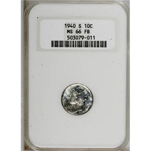 <B>1940-S 10C MS66 Full Bands NGC.</B></I> NGC Census: (227/84). PCGS Population (429/107). Mintage: 21,560,000. Numismedia Wsl. Price for NGC/PCGS coin in MS66: $125. (#5027)<BR><BR><B>Coin Engraver:</B> Adolph A. Weinman<BR><BR><b>Shipping:</b> Coins & Currency (<a target="_blank" href="http://www.heritageauctions.com/common/shipping.php">view shipping information</a>)