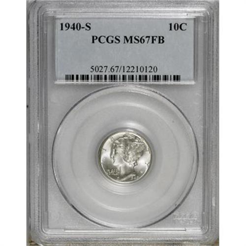 <B>1940-S 10C MS67 Full Bands PCGS.</B></I> . PCGS Population (105/3). NGC Census: (82/2). Mintage: 21,560,000. Numismedia Wsl. Price for NGC/PCGS coin in MS67: $500. (#5027)<BR><BR><B>Coin Engraver:</B> Adolph A. Weinman<BR><BR><b>Shipping:</b> Coins & Currency (<a target="_blank" href="http://www.heritageauctions.com/common/shipping.php">view shipping information</a>)