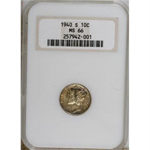 <B>1940-S 10C MS66 NGC.</B></I> NGC Census: (569/265). PCGS Population (771/125). Mintage: 21,560,000. Numismedia Wsl. Price for NGC/PCGS coin in MS66: $41. (#5026)<BR><BR><B>Coin Engraver:</B> Adolph A. Weinman<BR><BR><b>Shipping:</b> Coins & Currency (<a target="_blank" href="http://www.heritageauctions.com/common/shipping.php">view shipping information</a>)