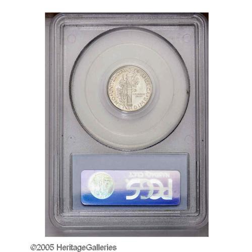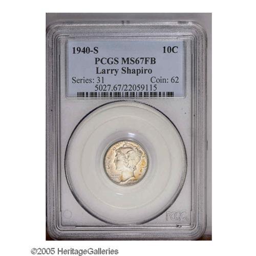 <B>1940-S<10C> MS67 Full Bands PCGS.</B></I> Fully struck and pristine, with pleasing satin luster and lovely steel-blue toning, accented by speckled dark-green and red-orange patina. Not many 40-S dimes can match the overall technical and visual quality of this Superb Gem example. Population: 105 in 67 Full Bands, 3 finer (12/05).<BR><I>From The Larry Shapiro #1 All-Time Finest Mercury Dimes Full Bands Basic PCGS Registry Set.</B></I>