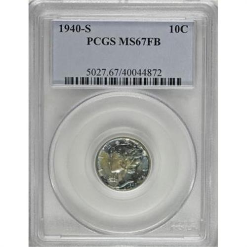 <B>1940-S 10C MS67 Full Bands PCGS.</B></I> Splashes of gunmetal blue and golden-gray over intensely lustrous surfaces. This stunning coin, boldly struck with flawless surfaces, is a beauty to behold. PCGS has certified just three finer Full Bands examples (09/07).<BR><BR><B>Coin Engraver:</B> Adolph A. Weinman<BR><BR><b>Shipping:</b> Coins & Currency (<a target="_blank" href="http://www.heritageauctions.com/common/shipping.php">view shipping information</a>)