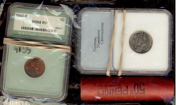 1940-S, 1953-S MS68RB & 1948 MS67RD 1¢. Lot of 3 coins graded by NTC (Numistrust Corporation). Also includes 1961 5¢ NNC PR69, 1962 NNC MS67FS & 1977 PCI MS67FS, 1953-D US 50¢ & 1960 NNC MS66 FBL. Also includes 2001-S 50¢ and 2002-S 25¢ (Louisianna) both ICG PR70 DCAM and 1955 1¢ Original BU roll. Should be viewed. Lot sold as is, No returns.